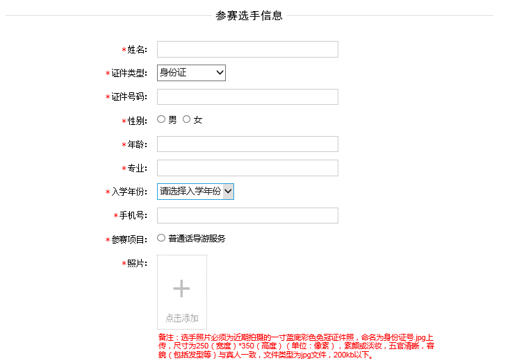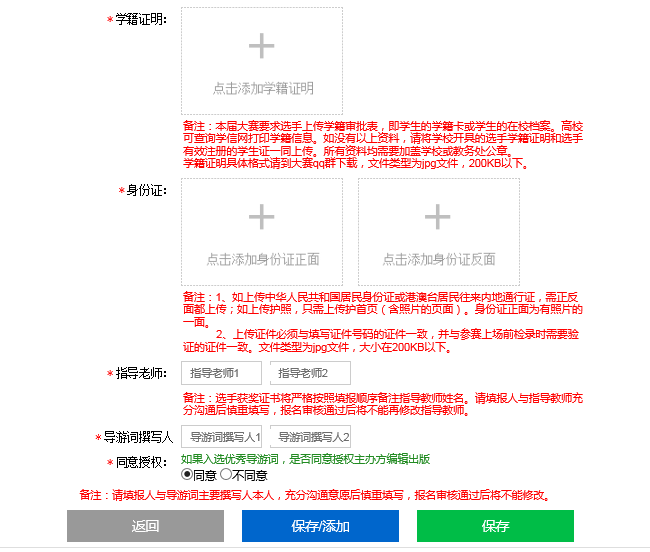 (1)领队和随队教师不需要提交照片。领队只能填报1人。随队教师至少填报1人,高校组最多4人,中职组最多2人。