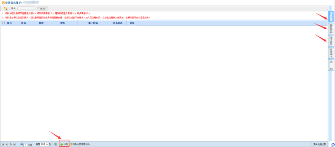 4、点击对应的按钮录入领队、随队教师及选手信息。