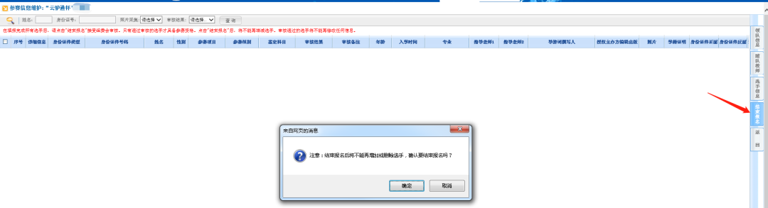 7、所有信息录入完成后,点击结束报名,进入信息审核环节。