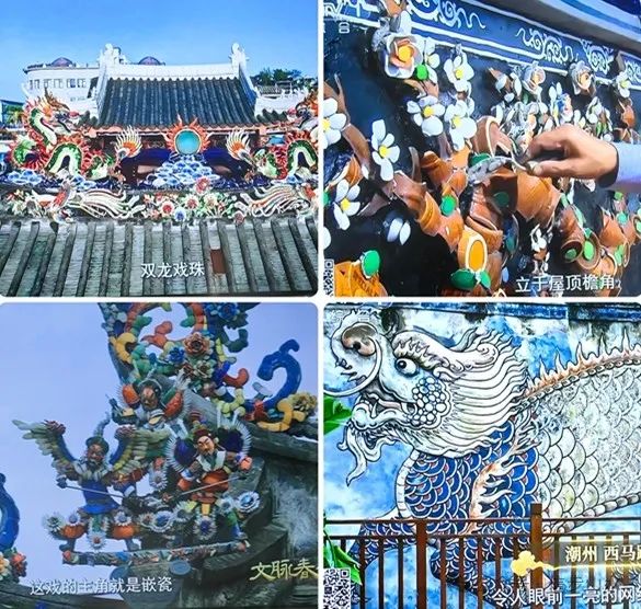 古城特色。潮州功夫茶,泡茶有21道工序,潮州人宁可三日无食,不可一日无茶,称茶为茶米。潮州鱼饺等美食,体现了潮州人的精致生活。潮州木雕,“龙虾蟹篓”镂空雕,层次丰富,好似竹编,生动逼真。潮州灰塑工艺,用红糖水、贝壳灰等作为塑形材料,潮州古城郑家祠老照壁-麒麟照壁就是采用了灰塑工艺进行修复,还原了历史印记,圆满展现给世人。
