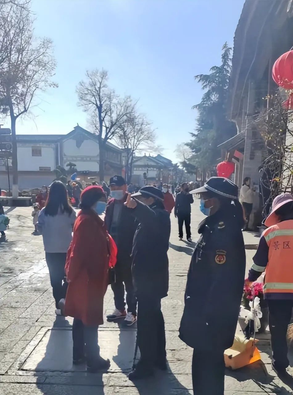 2月3日,大理古城玉洱路防疫点夜班值守队员罗超、赵春霞在玉洱路与复兴路口发现一男孩在路边哭泣,经安抚得知男孩与父母走失,值班队员一边和警务室联系,一边立即将男孩体貌特征及照片上传大理古城景区夜班工作群,通知古城内各路段值守队员加强巡查,寻找走失男孩父母。十分钟后,洋人街巡查队员反馈“有游客在洋人街求助小孩丢失”,经过现场确认,小孩找到父母。