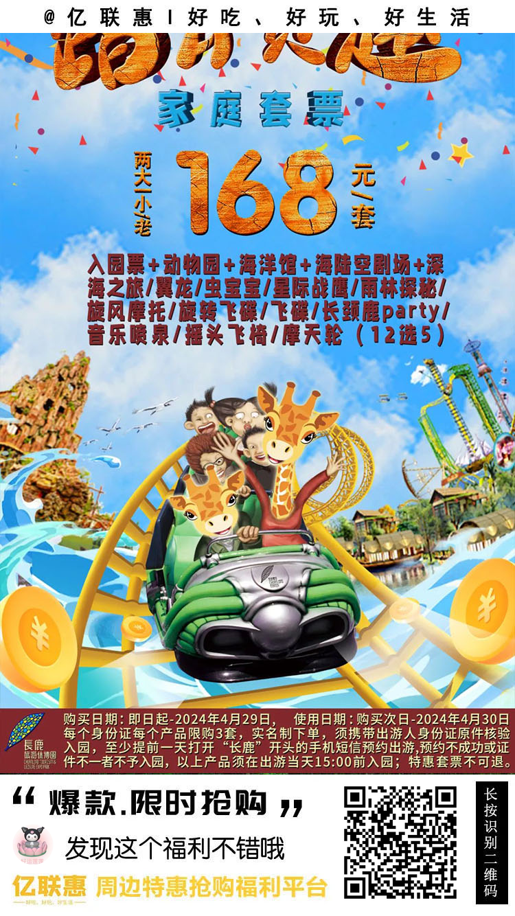 【长鹿旅游休博园】168元抢2大1小/老家庭游套票,含入园观光票+动物园+矿洞海洋馆+...