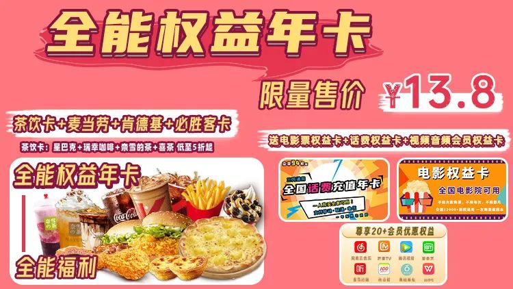 ①【王牌全能权益卡】13.8元秒杀!茶饮权益年卡+麦当劳+肯德基权益年卡+电影票+话费权益卡!体验多项权益,承包你的吃喝玩乐!