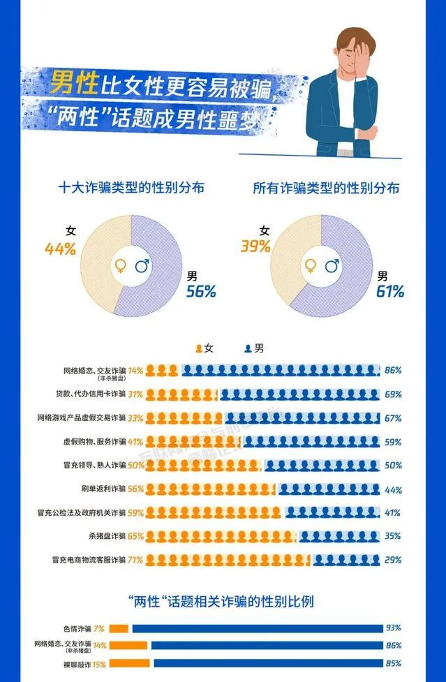 《2021年电信网络诈骗治理研究报告》显示,色情诈骗男性受害占比93%,网络婚恋、交友诈骗男性受害占比86%。