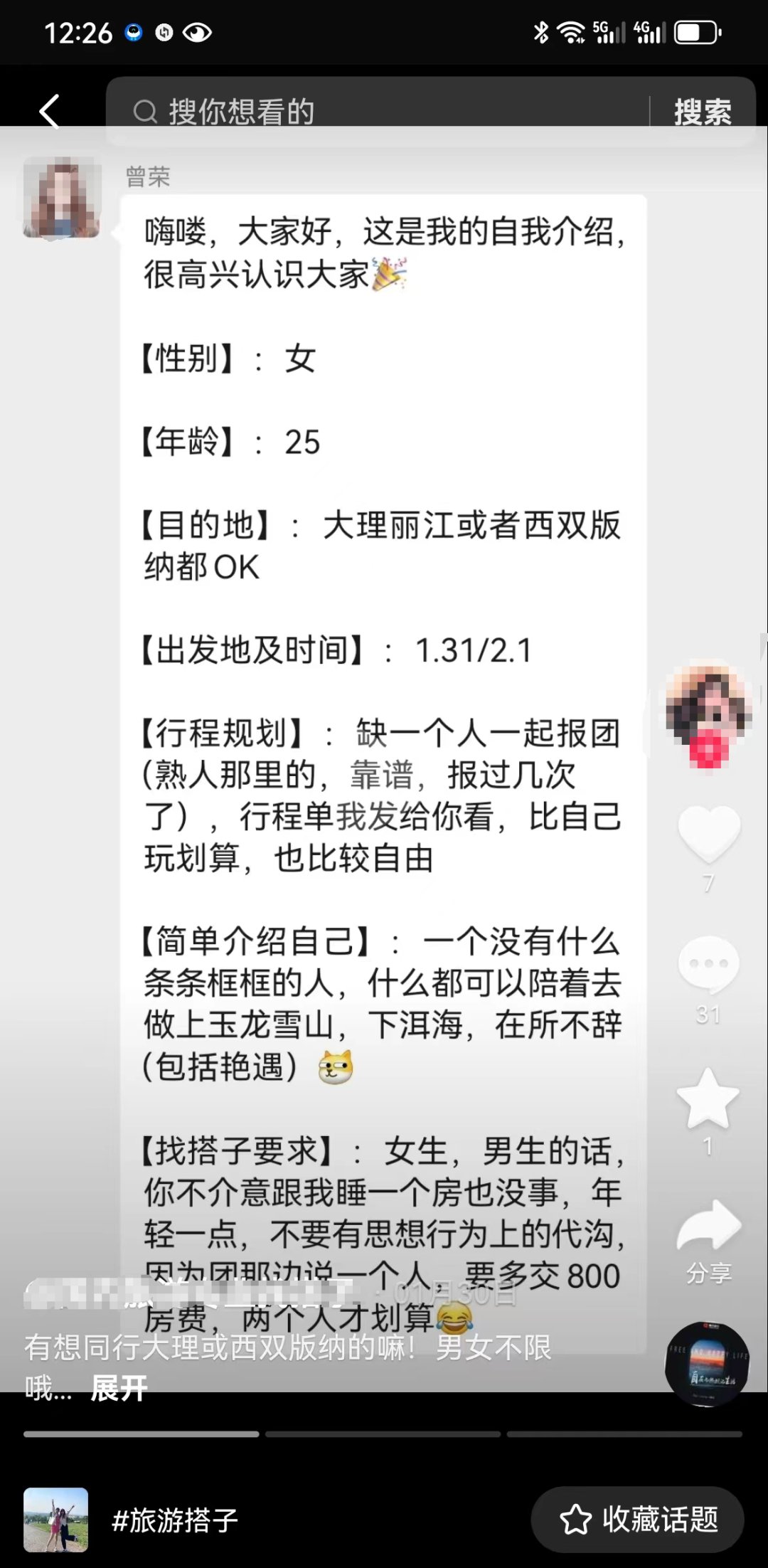 一个女的,找旅游搭子,说睡一个房也没事。我这正气血方刚的年纪,这谁顶得住啊。于是就私信过去看看到底怎么回事。