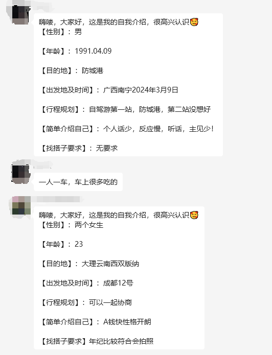 但对于群主来说,既不用给业务员发工资,还拉到了用户进群。除了“旅游搭子”,还有“健身搭子”、“饭搭子”、“自习搭子”、“酒搭子”各种各样。只不过“旅游搭子”因为风险太大,聪明人都不做了。