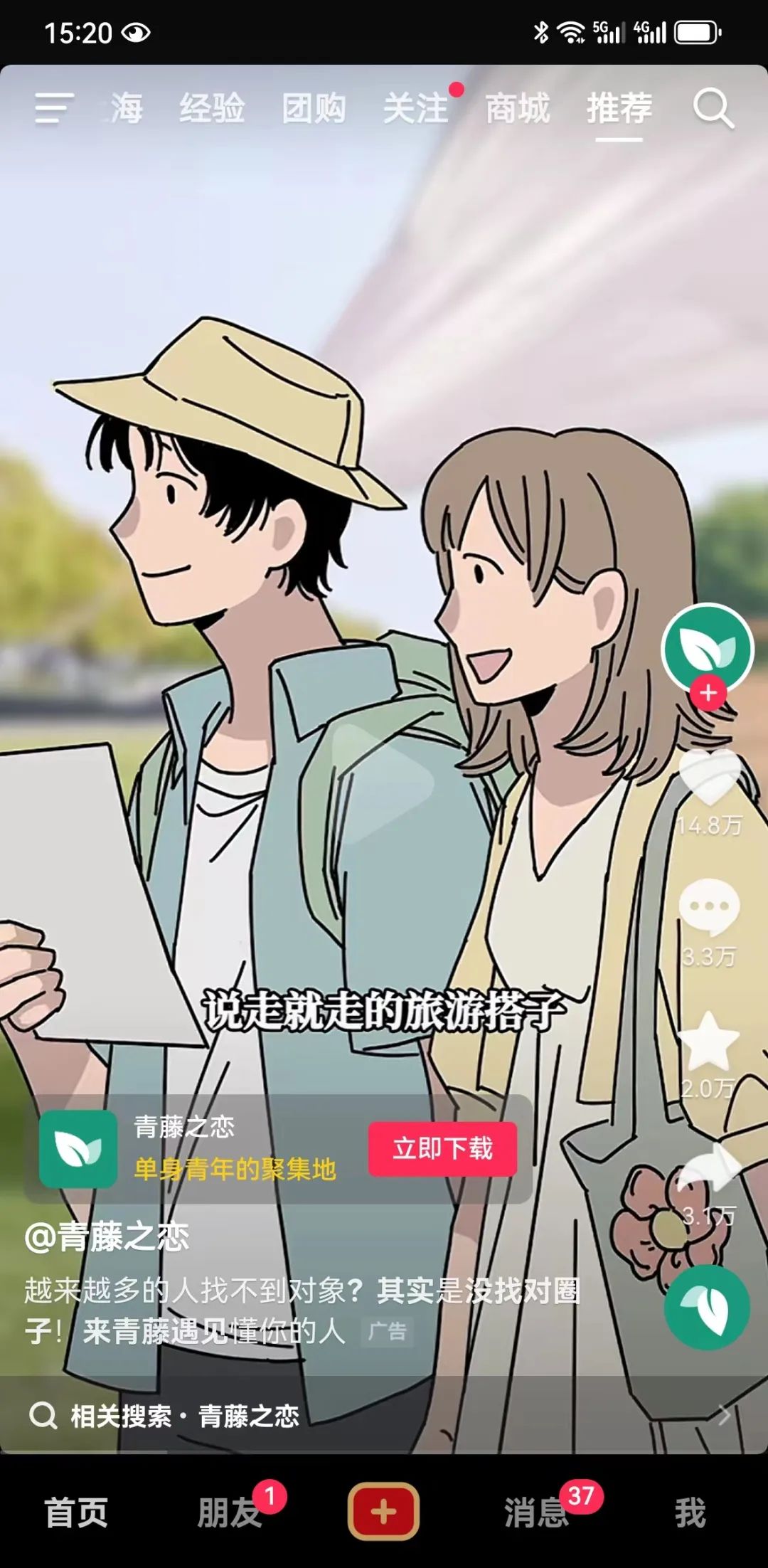事情的起因是我原本就在规划4、5月份的出游行程,在抖音上搜索了一些目的地关键词。结果几天后,抖音开始疯狂对我推送“旅游搭子”相关视频。