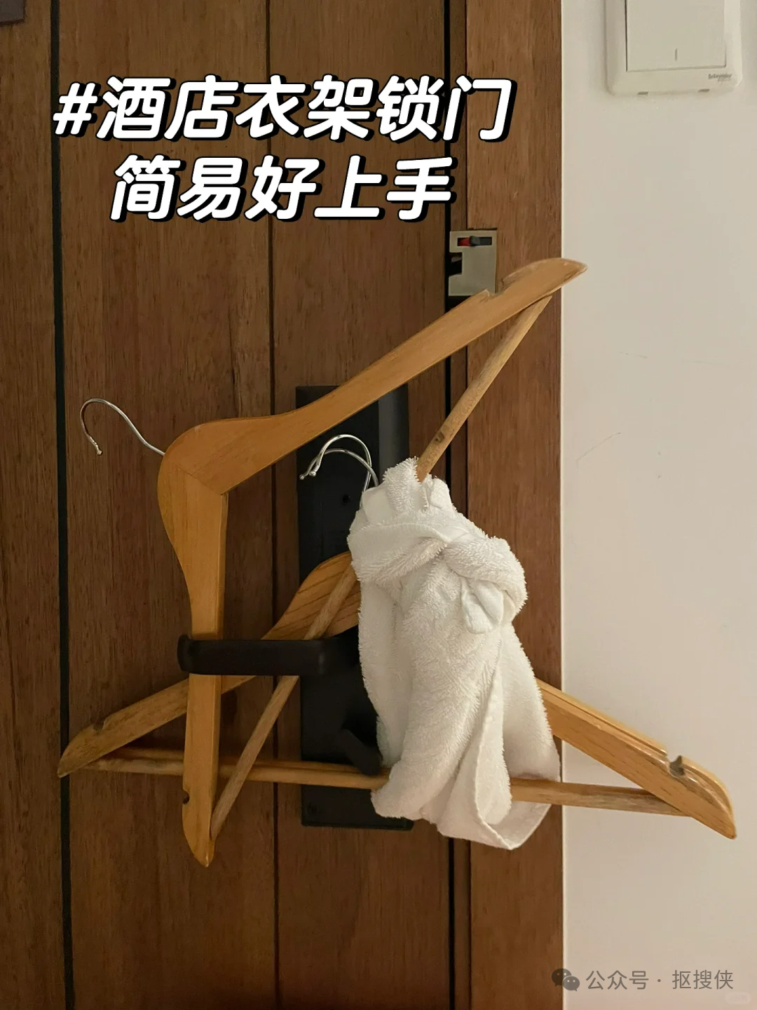 独自或两人出行时酒店房间的安全问题总是让人担忧。除了使用酒店提供的门锁和保险链外你还可以巧妙地利用衣架来增强房间的安全性!