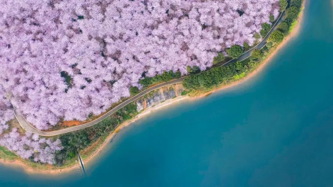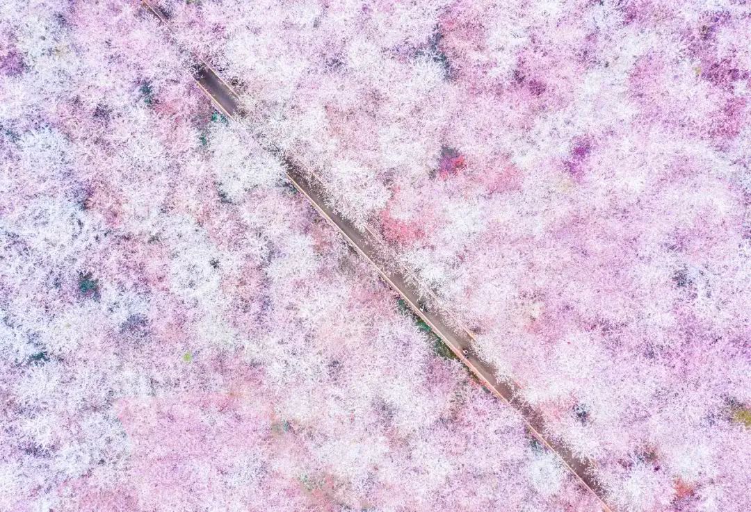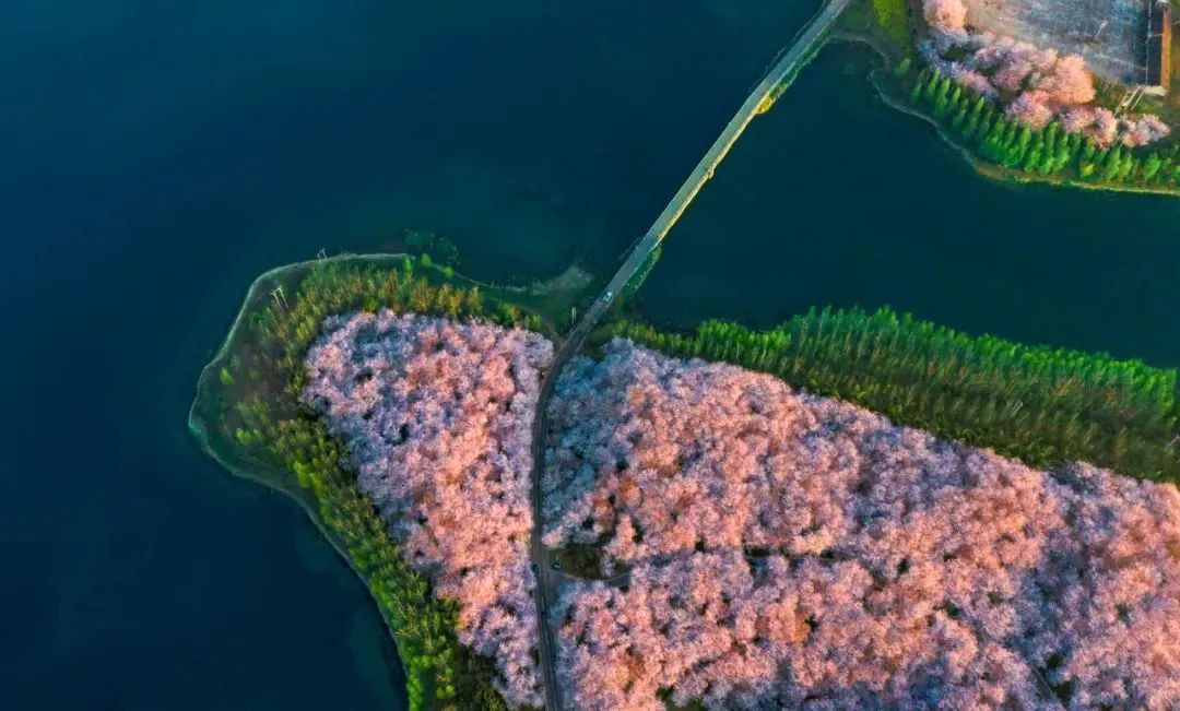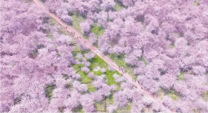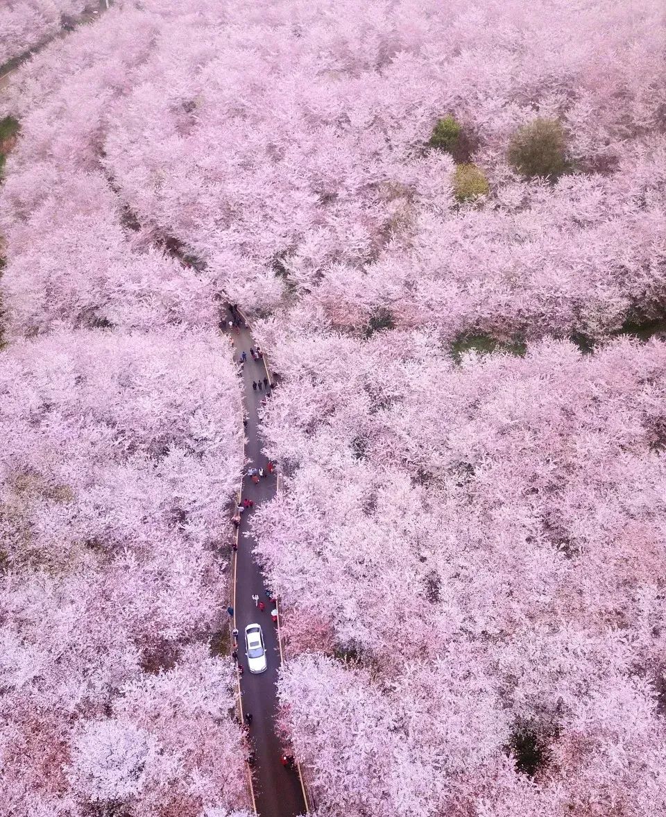 万亩樱花灿烂盛放的景象,宛若世外桃源。