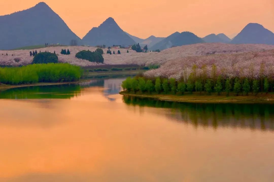 黛色山、湛蓝水、青翠树、粉花海,