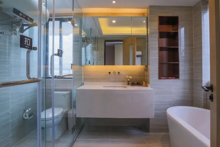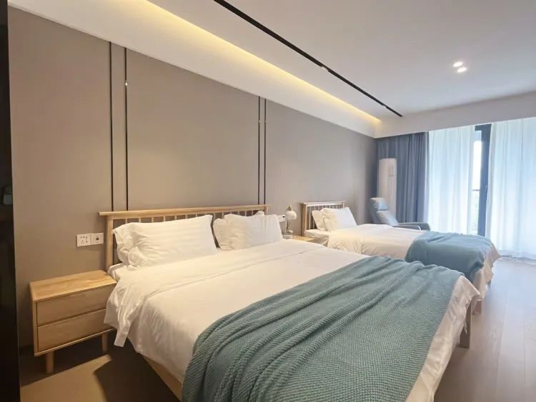 客房内部装饰也是以素雅为主,用莫兰迪色调构建简约的色彩空间,更于其中糅合进许多自然元素,让入住此中更多了一分韵味。“融入自然,归于自然”