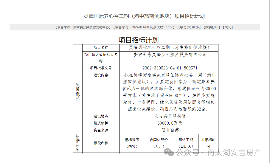 3月8日,安吉县公共资源交易中心发布“灵峰国际养心谷二期(港中旅南侧地块)”项目招标计划,标志着该项目即将启动。