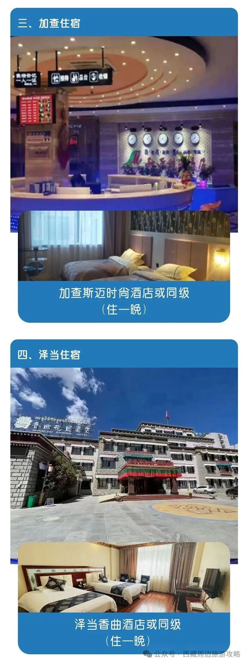 2.【住宿】旅行全程住宿费用,包括藏家民宿,酒店二人间,详情如下: