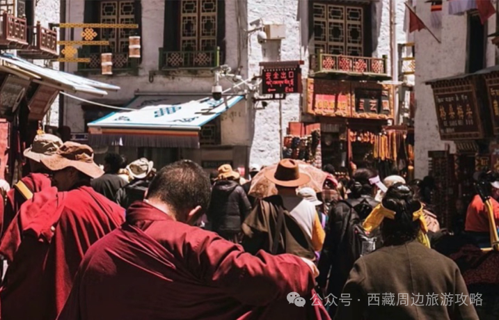 环大昭寺外墙一圈称为 “八廓街”即八角街。便是藏民们行转经仪式的路线。它汇聚着来自各地的朝拜者,在老老的街道,在旧旧的小巷,穿着鲜艳民族服装的藏胞和衣衫褴褛的信徒拥挤在同一条转经道上。这里滋生着各式的诱惑,化成了一个难以抗拒的磁场。