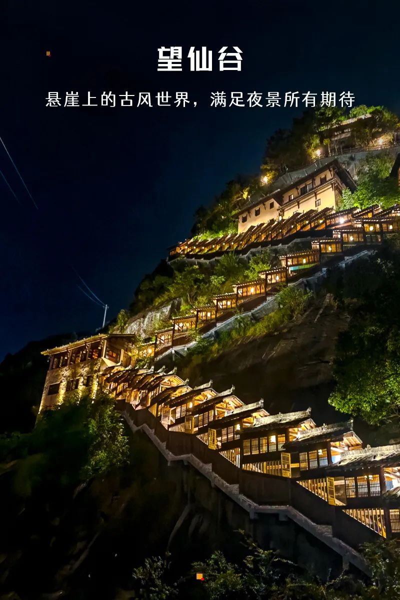 望仙谷源于东汉,始于三国,辖93平方千米。望仙谷以山、水、谷、村、寺、林、田为资源本底,有峡谷漂流、栈道探险、岩铺民俗、天心禅寺、南山桃源、三叠水、胡氏宗祠等众多景点。悬空民宿,传说上古大洪水,白鹤衔来野果解救被围困于崖上的村民而得名“白鹤崖”。东汉胡昭在此羽化成仙后,历代又有众多道家方士慕名而来,在崖上结庐修行。白鹤崖垂直高度有110多米,为复原旧时盛况,白鹤崖上建有12间悬空玻璃客房、悬崖图书馆、悬崖餐厅和高空观景台,可俯瞰整座山谷,远眺灵山龙脊。