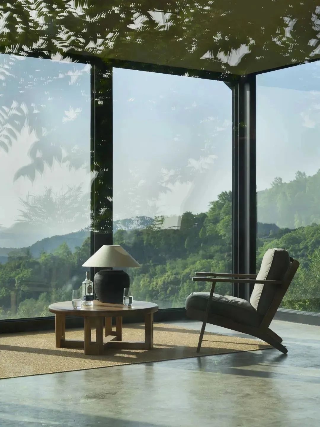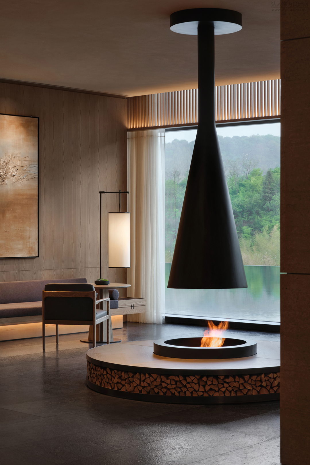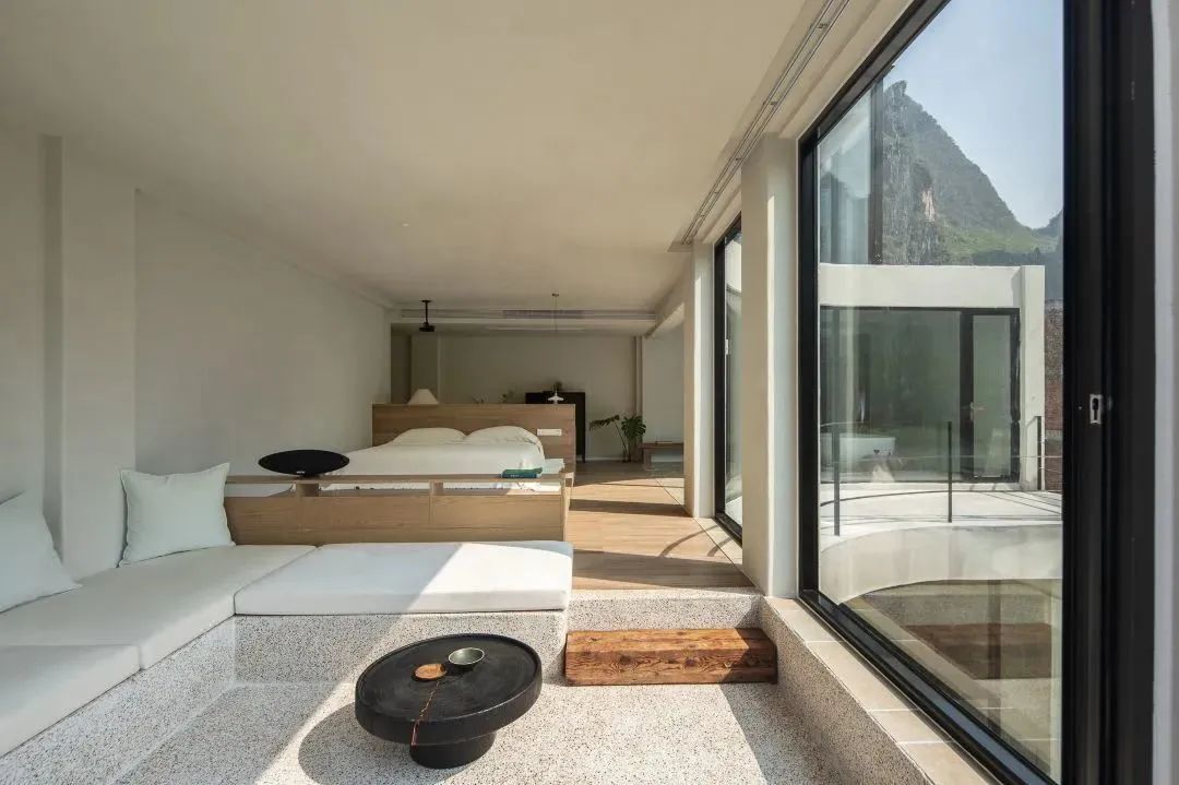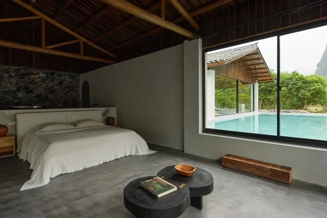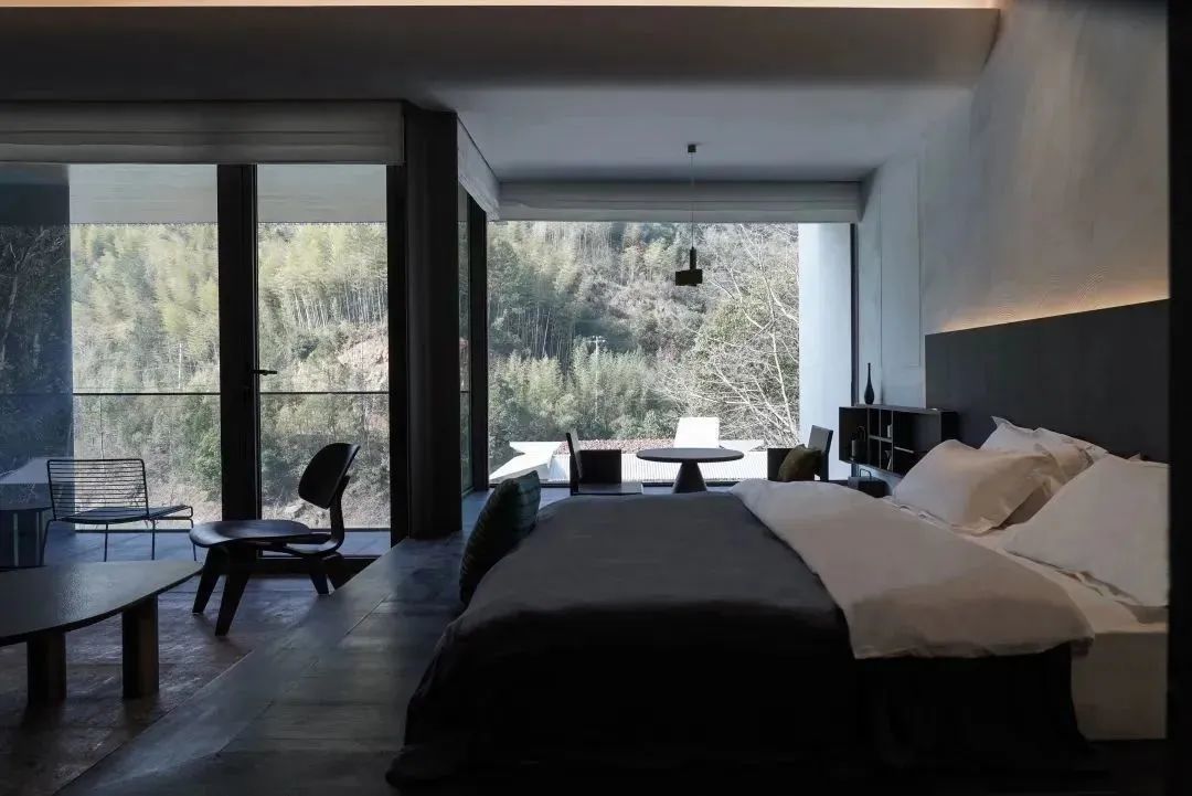 酒店在山水画卷般的漓江风景里,让建筑自然而然地生长而出。如林间树、山间岚一般,自然、自在,整体呈现冷淡高级的侘寂风。
