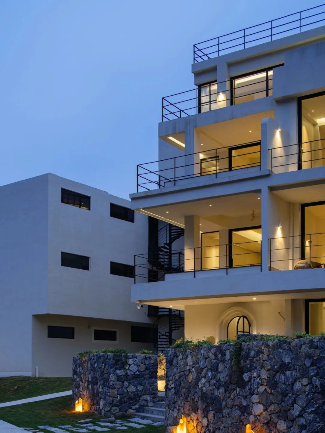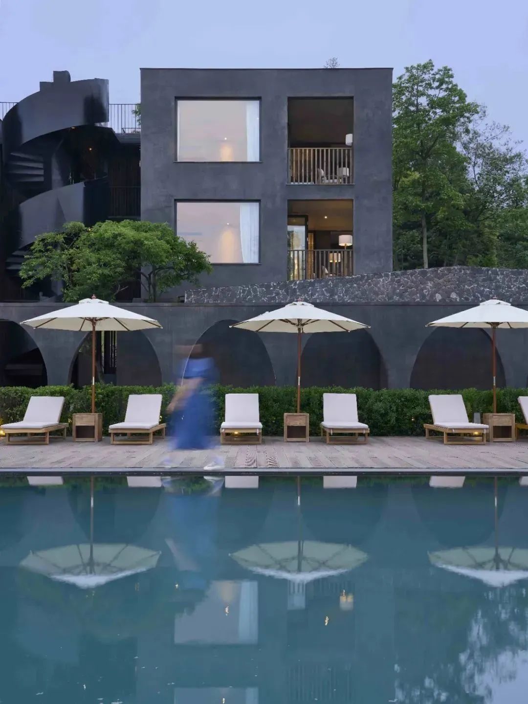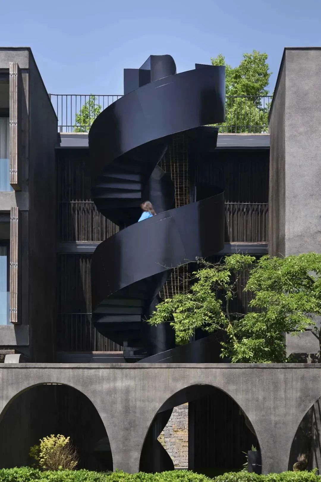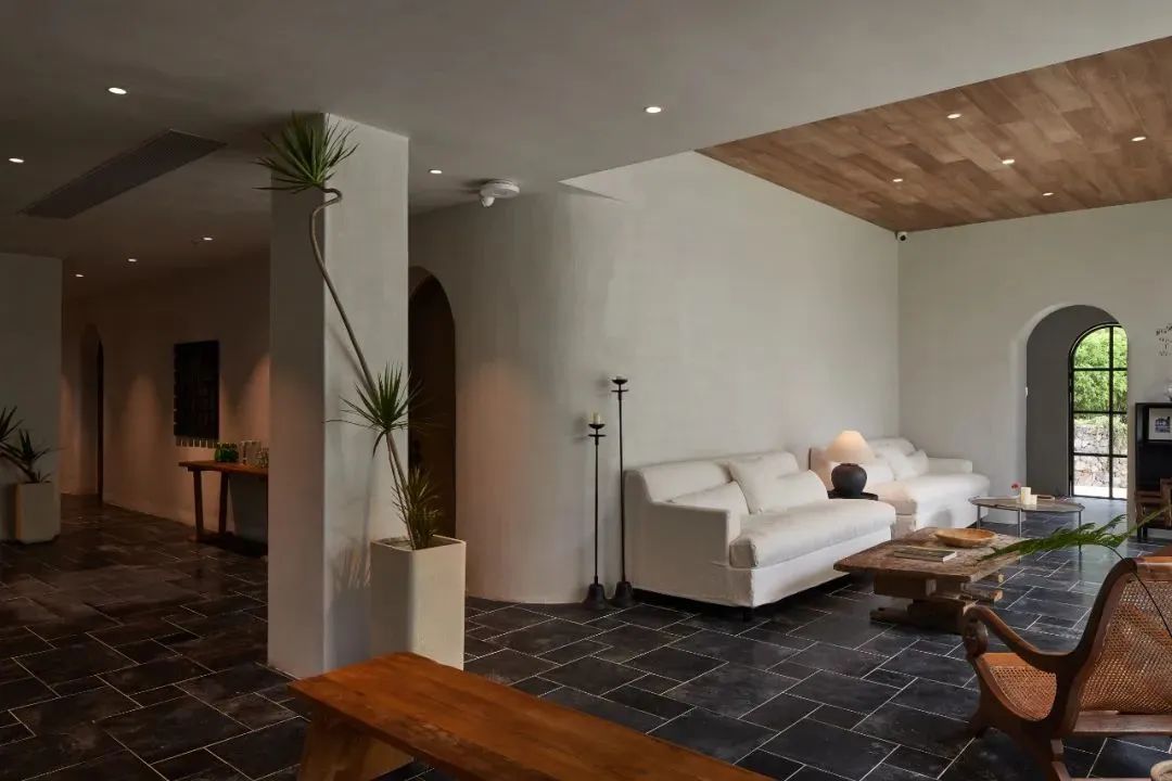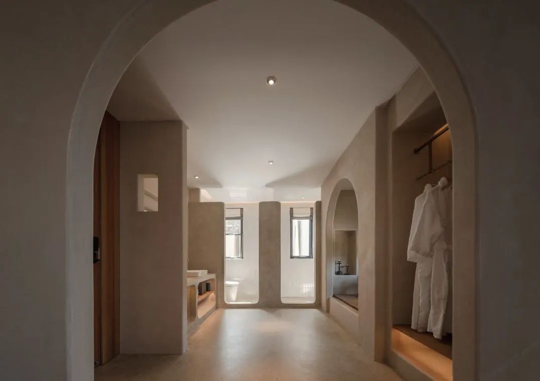 酒店整体以黑白灰的色调和简洁几何的结构为主,并融入了极简的东方禅境意味拱形走道、旋转楼梯、迷宫式小径等。使空间在过度上有豁然开朗的舒畅感。