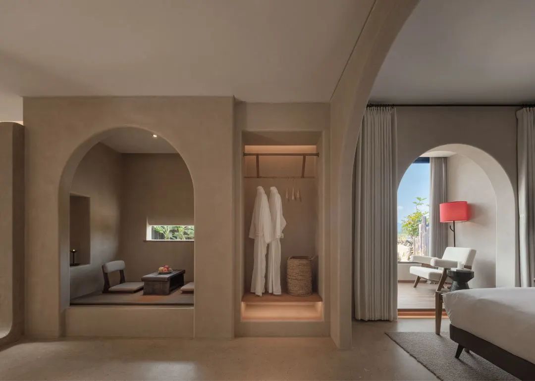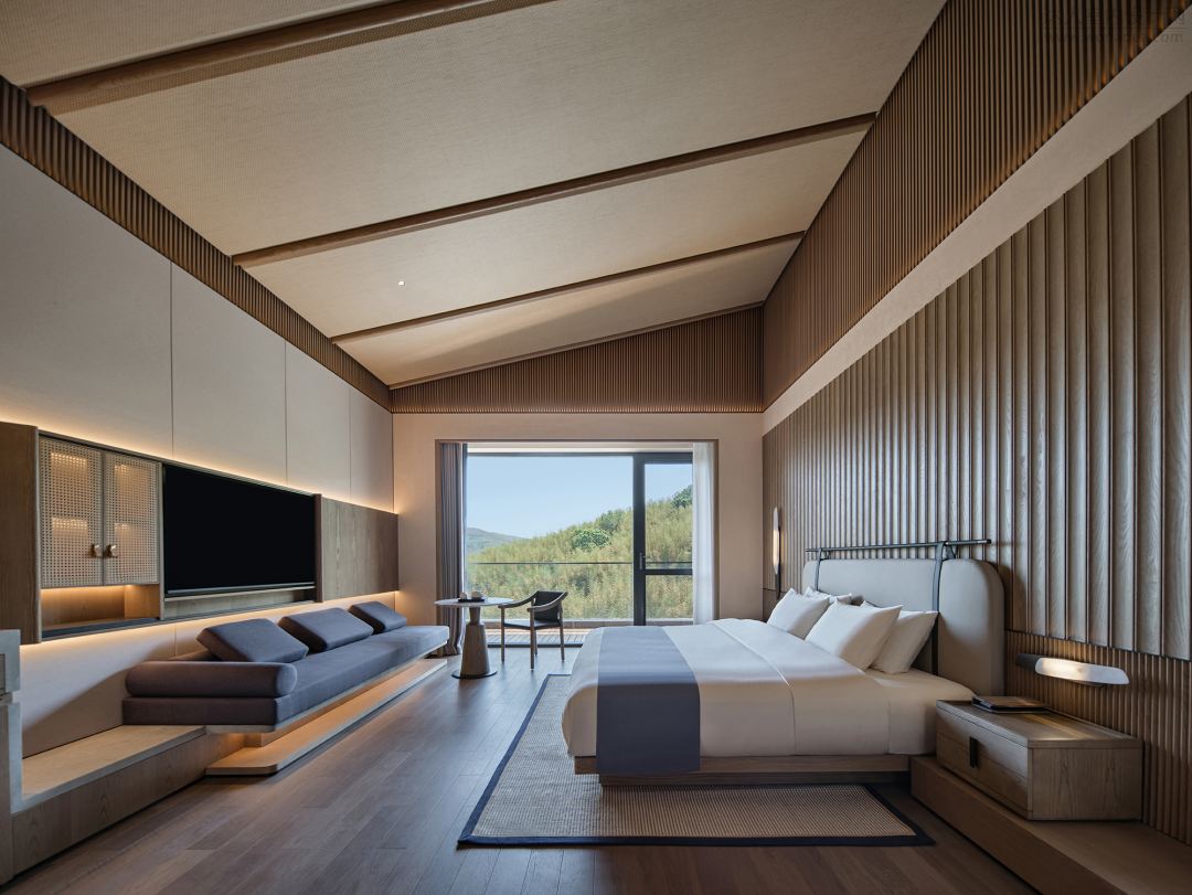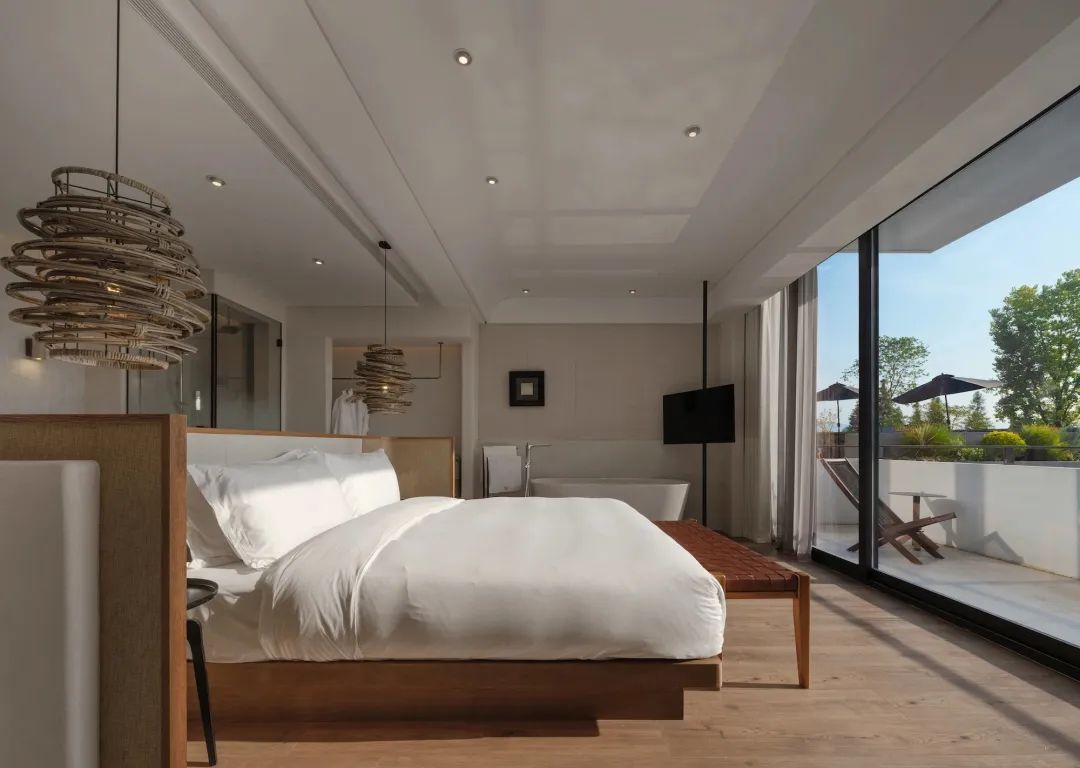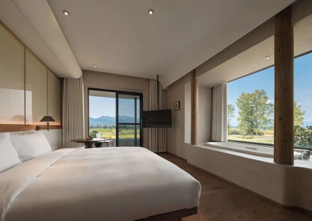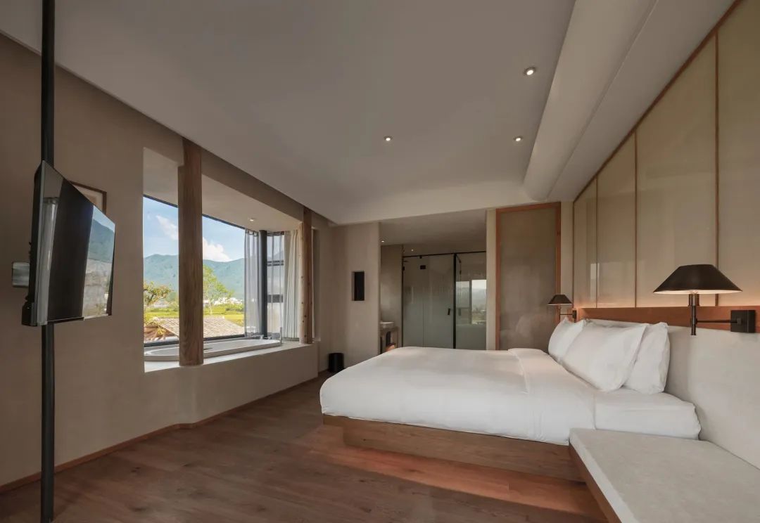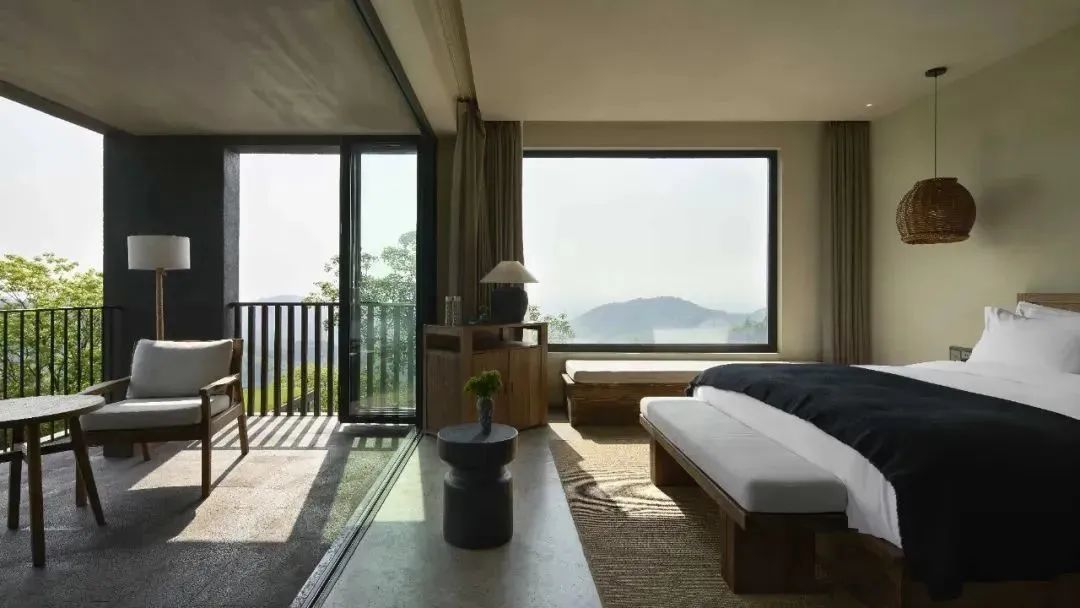 卧室的窗景可远眺群山,内置软装规则的几何线条互相构建层次,保持通透,予人柔和之感。出行落宿,也能感受家的温度。