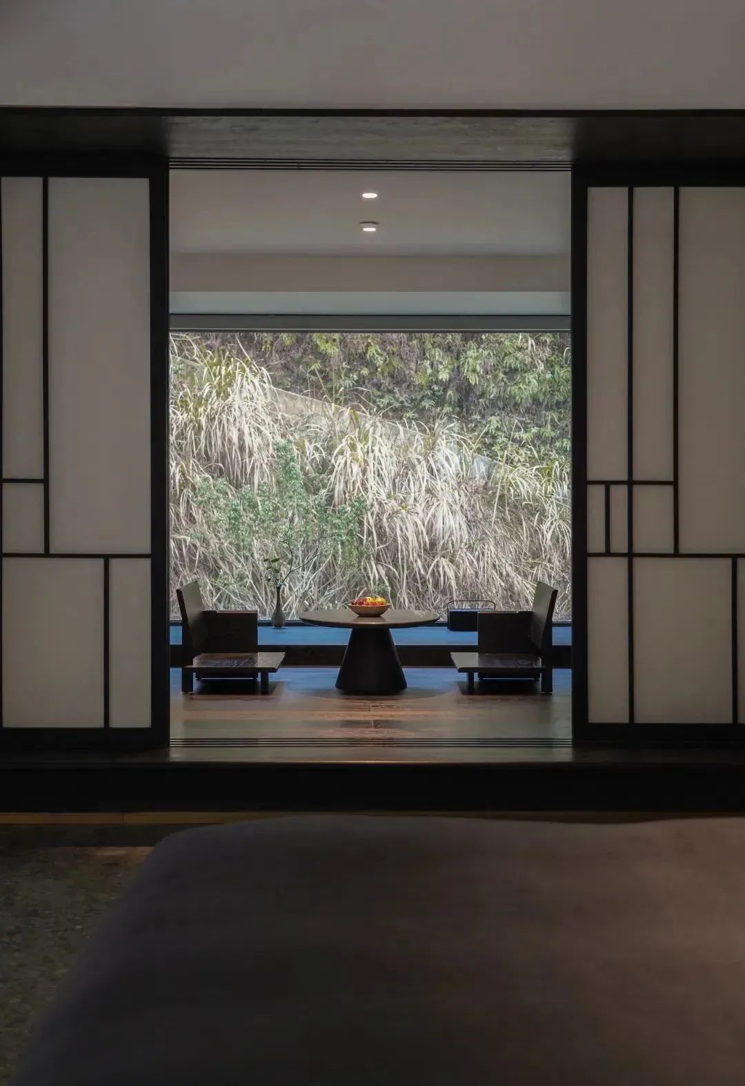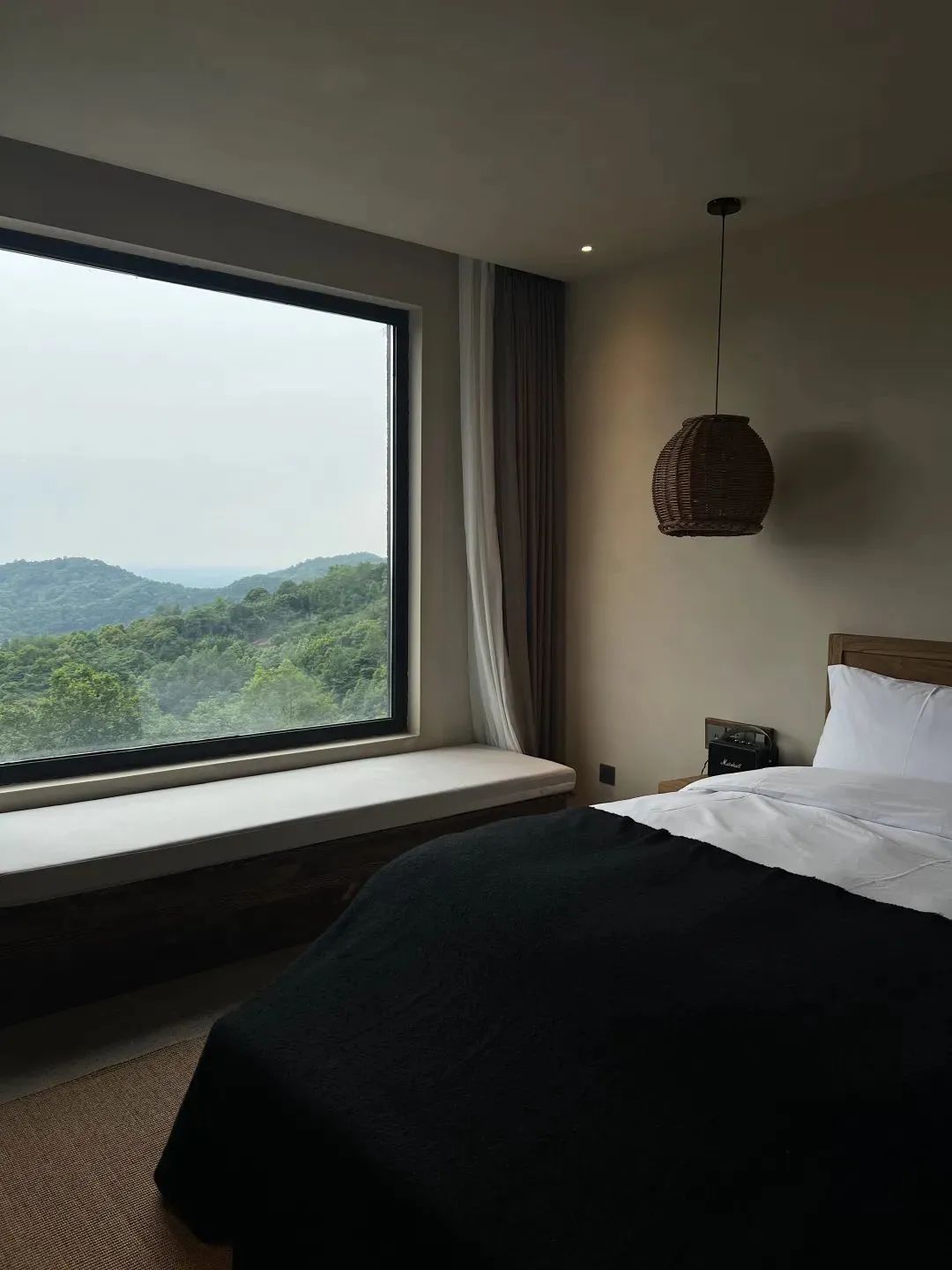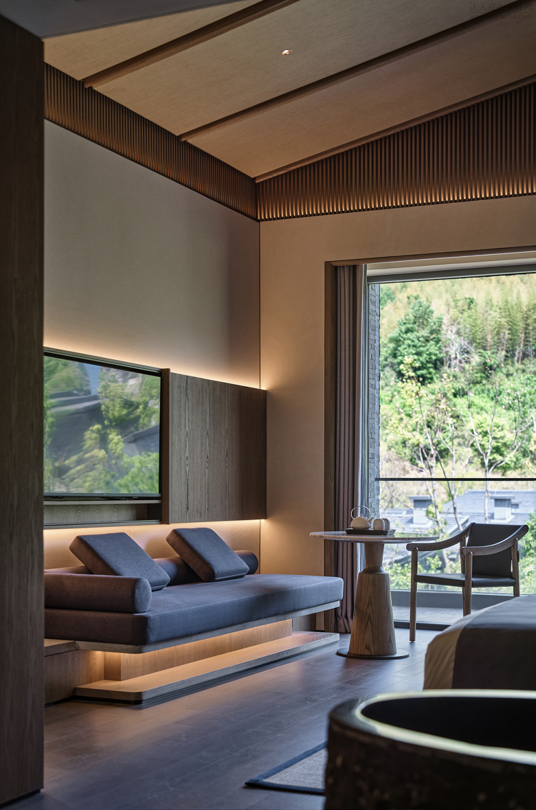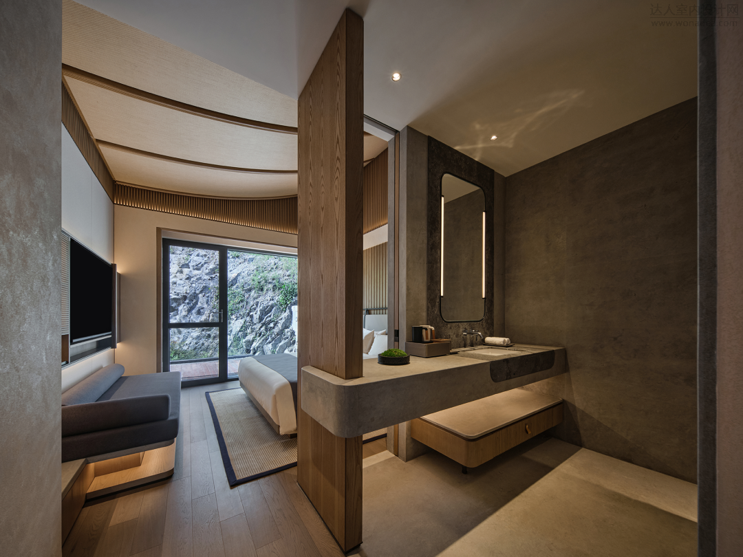 卧室的窗景可远眺群山,内置软装规则的几何线条互相构建层次,保持通透,予人柔和之感。出行落宿,也能感受家的温度。