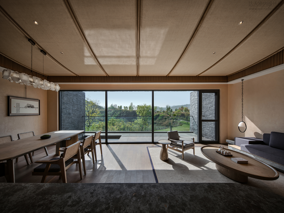 室内整个空间延续了暗色淡然的气质,再用柔和温暖的色调来中和,将度假感和高级感巧妙融合在了一起。大面积落地窗的设计将室外自然山水引入室内,一丝一角都散发出不动声色的高级感。