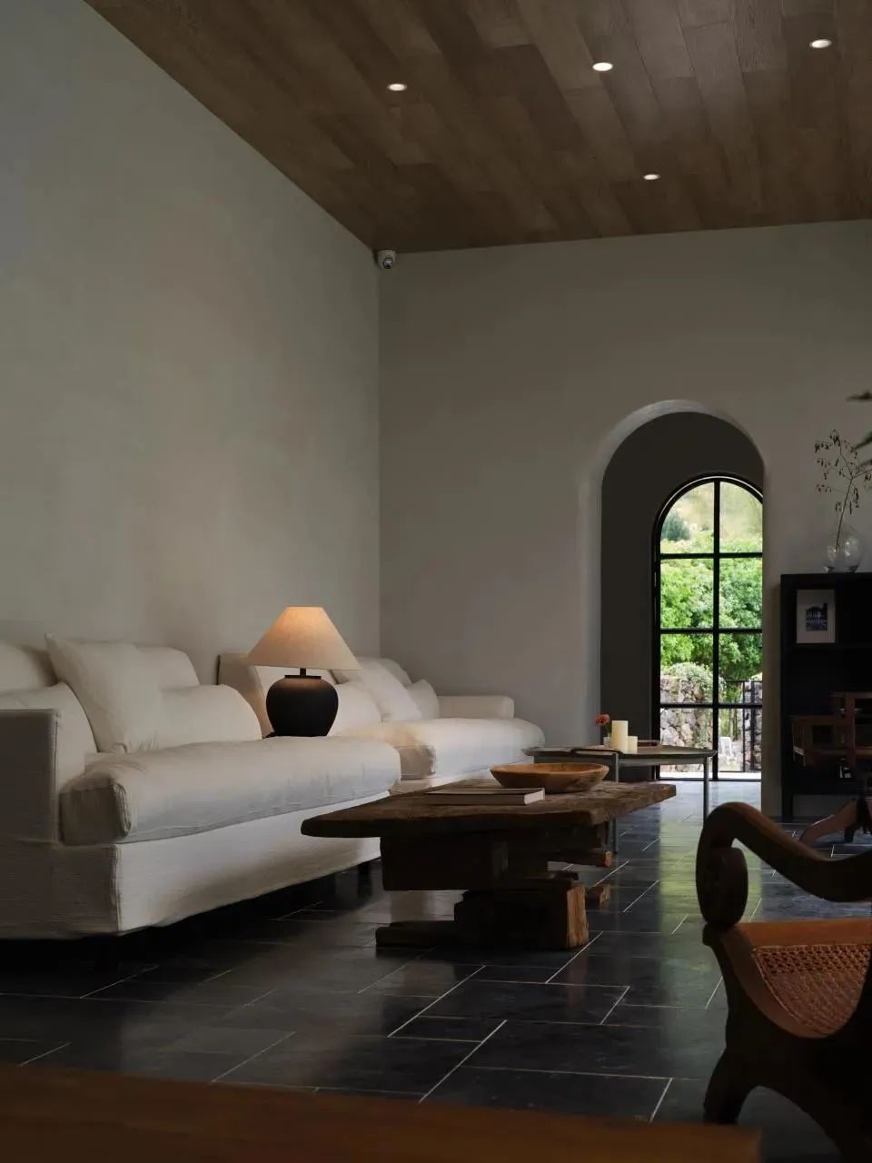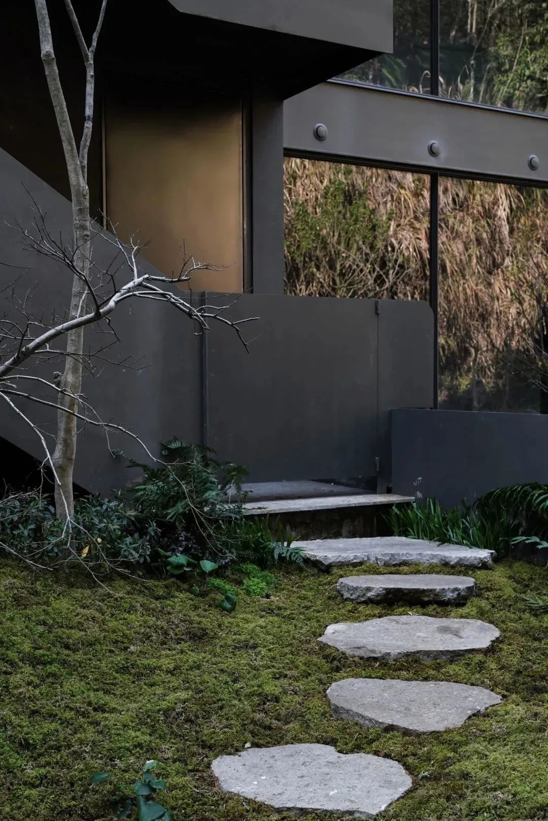 推门而入,穿过长廊,有种曲径通幽处的豁然开朗。扑面而来的度假感和刚进门处的隐蔽形成了强烈的反差。承包整片山野打造独栋villa,山野树木的生命力同建筑共生长,和自然和谐融入在一起。