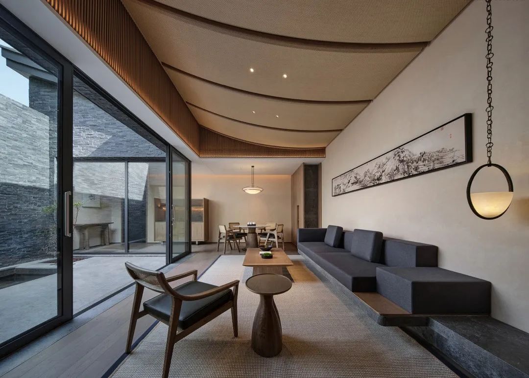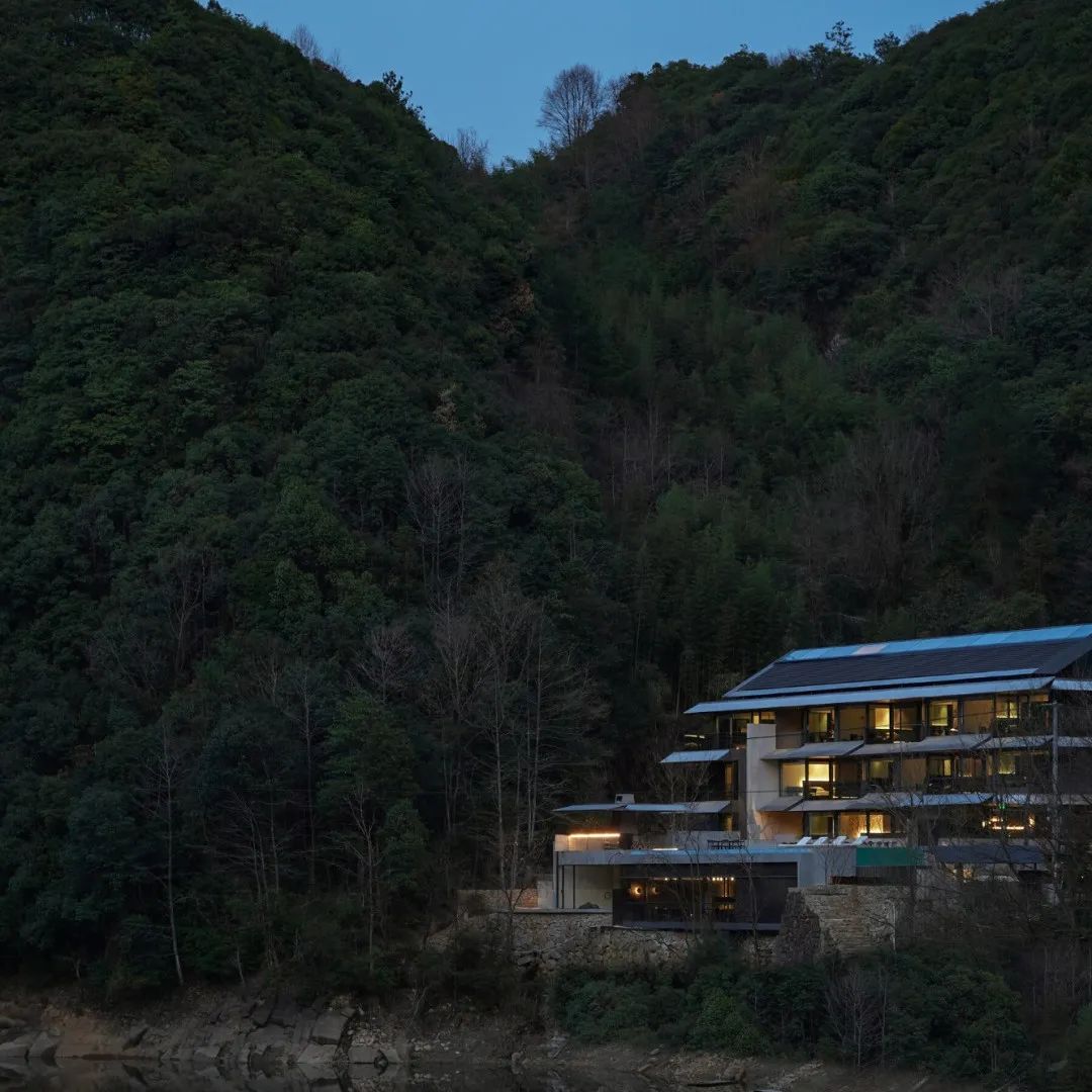 该项目落址于杭州临安区潜川镇青山殿村过水自然村,背靠青山,面朝昌化溪。建筑及室内设计均是GOA大象出品,整体延续了一直以来的深色基调,再加以温暖的元素中和,将东方美学融于这片江南风景,赋予了诗意与灵气。