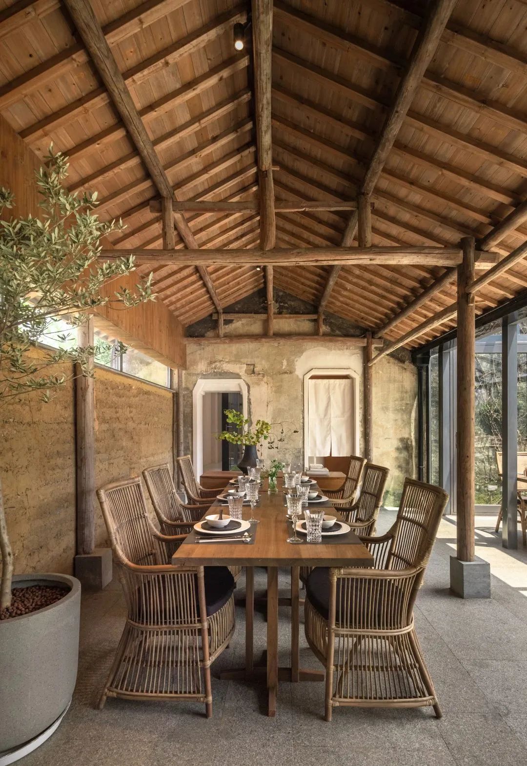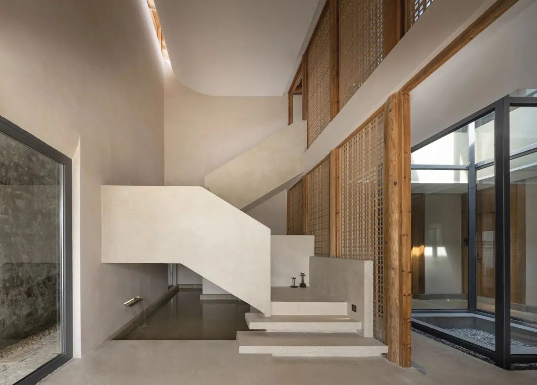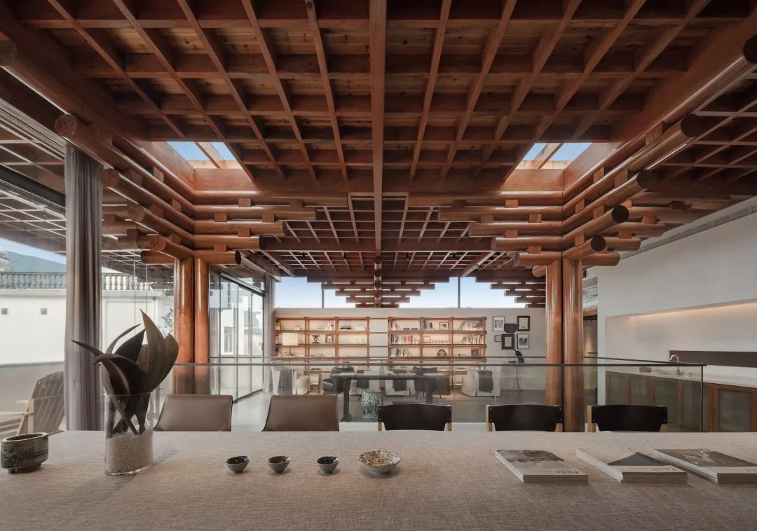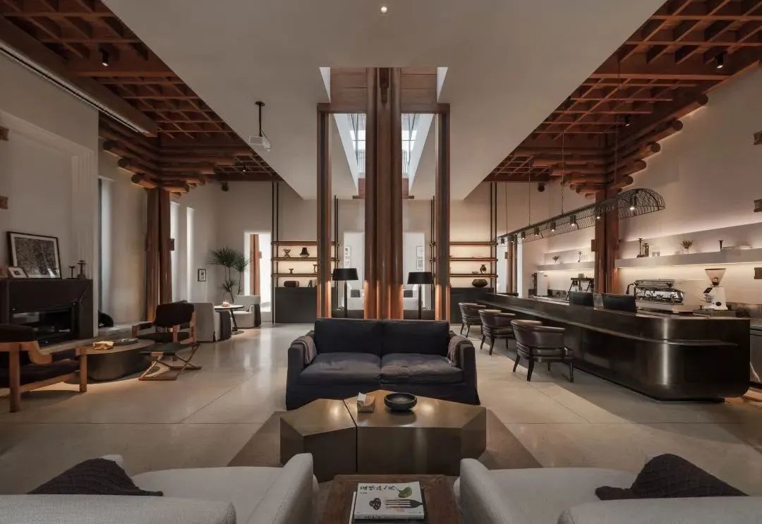 大堂为博雅堂,原为村落祠堂旧址,设计师通过对宁波保国寺主殿瓜楞柱(北宋)的结构原理解读,形成当代版的新柱式“束柱叠梁”,在废墟中重构气势恢宏的空间。