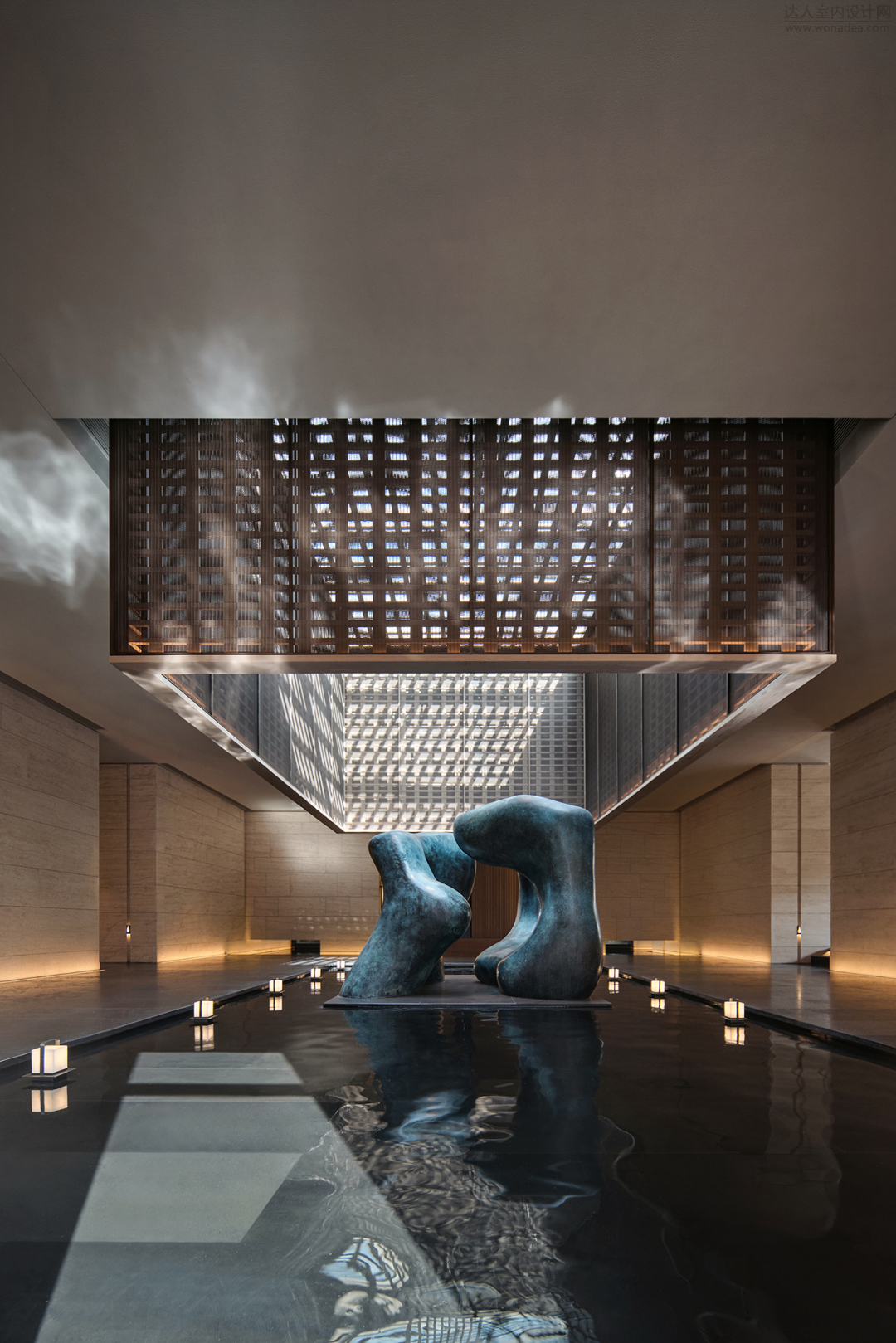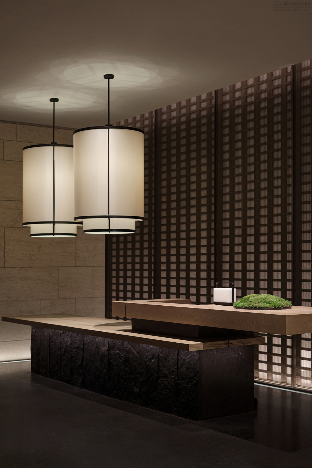 酒店入口处以灯带洄游动线与水景呼应,延续光影,射灯下照,在地面呈现一步一点的圆形光斑,仿佛花园石径,顷刻点燃鼓乐的律动。