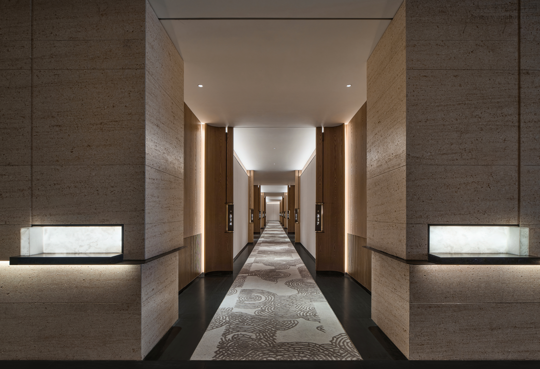 走廊处长幅地毯的花纹诠释当地的传统雕刻,表达丰富的视觉感受。大理石与玉石的交错使用,让空间的边界化为虚有,融入人们行走其中内在的默默情愫。