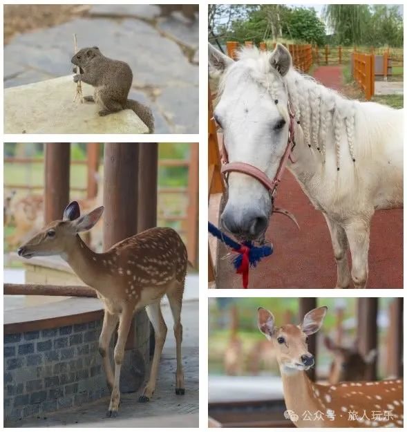 还能与白鹿、梅花鹿、小松鼠、鹦鹉等动物亲密互动哦。