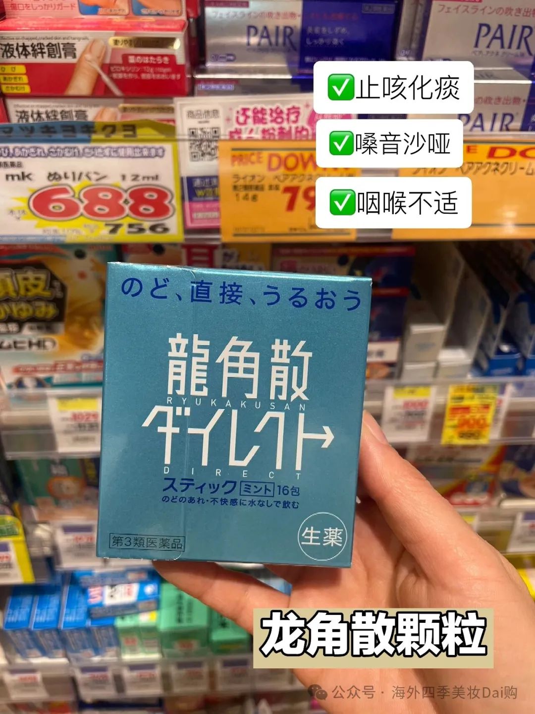 龙角散颗粒是第三种推荐YAO物,它以颗粒形式存在,能迅速针对咽喉发挥作用,这款YAO物有薄荷、水蜜桃两种口味,同时还推出了芒果味的含片,龙角散颗粒中的中草YAO成分能带来清凉感,让人感觉舒适。