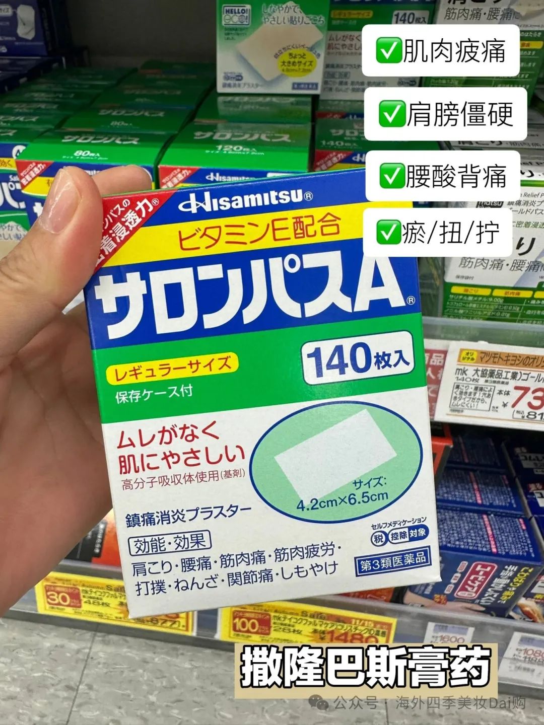 撒隆巴斯膏YAO是一种适用于缓解镇痛和消炎的YAO物,每次我回国都会为家里的老人带几盒备用。使用时需要注意,在8到12小时后撕掉,以免加重皮肤负担。此外,它有多种型号可供选择,满足不同需求。