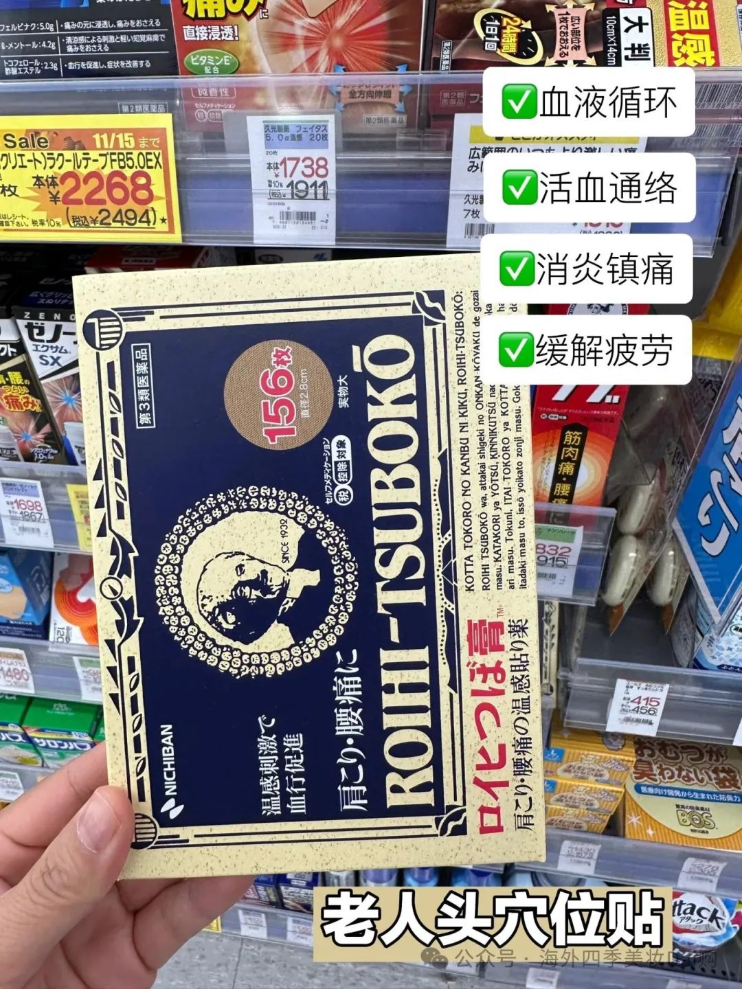最后是老人头穴位贴,适用于缓解腰痛、肩酸痛等。这款产品有温感和清凉感两种,购买时请注意选择。其圆形设计使其小巧方便,也适合贴在膝盖、关节等部位,而不像大的膏YAO贴会影响走路和活动。
