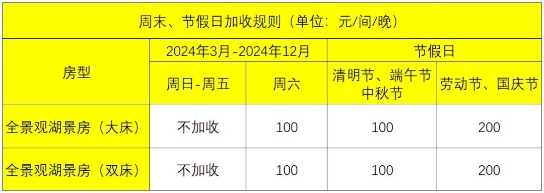 1、周日-周五入住不加收,周六入住加收100元/间/晚