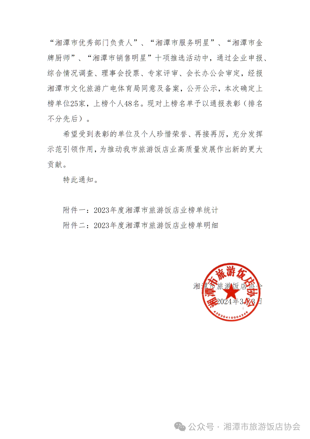 您现在的位置是:首页 > 国内旅游目的推荐 > 正文 国内旅游目的推荐 关于通报表彰 2023 年度湘潭市旅游饭店业榜单推选活动上榜单位及个人的通知 admin2024年03月11日 19:33:33国内旅游目的推荐128 点击上方蓝字关注我们吧扫码关注我们,收获更多资讯! 转载请说明来源于"旅荐网",部分内容转载自网络,如有侵权请联系qlwl@foxmail.com删除 本文地址:https://www.15386.cn/post/20687.html 上一篇 【E线旅游推荐会五星希尔顿99元特价】指定入住希尔顿欢朋大酒店或光华国际大酒店,门票已全含,1早3正餐全含,餐餐不低于12菜1汤 下一篇 河南旅游总览,古文化之都,为十大必游胜地排名 相关文章 香港3天2晚旅行攻略 资讯 | 清明节假期出游提示:做好行程规划 文明绿色出游 用英文逛中国:这个网站能直接规划行程 假期正当时!快收好这份蟠桃山游玩攻略! 清明假期别浪费!3个AI神器让旅游攻略10分钟搞定 近期堪舆行程安排 异乡好居新加坡2026直播季(附直播行程安排) 北京春季旅行攻略皇城春意,花开满城 游玩攻略已备好,速码出发,下一站桓台! 2026年行程计划(有更新) 发表评论 取消回复 评论列表 这篇文章还没有收到评论,赶紧来抢沙发吧~