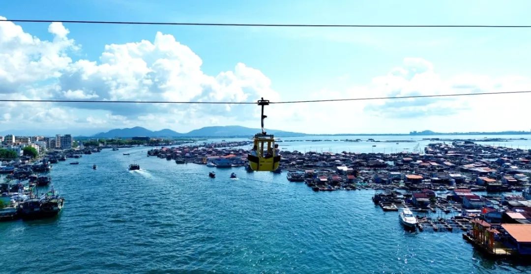 2138米长的跨海旅游观光索道成为南湾猴岛核心“重头戏”。缆车之行,浓郁的疍家文化扑面而来,高空俯瞰渔村部落,海上人家餐厅蓬勃,可见渔民用勤劳的双手编织一张张织沙渔网,投喂网箱中养殖的海洋生物。傍晚时分,渔家唱晚,疍歌示情,一艘艘渔船扬帆出海,载着百户收获的愿景,驶往大海远行作业,期待此行渔获满满,“疍韵”文化尽收眼底。