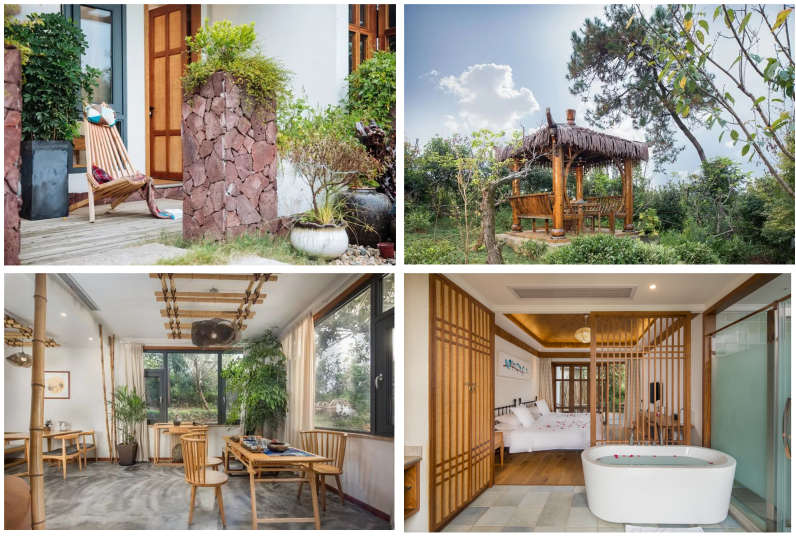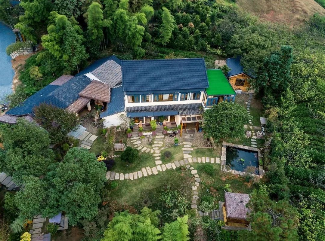 就这样,,每一位加入进来的民宿主的房子,都是量身定制的。每一幢都是根据民宿主的个性以及擅长的领域确定民宿的文化主题和风格的。我们一起来欣赏一下这些个性的艺术民宿吧~ 01帘青 是以休闲度假为主的,所以将其打造成了东南亚风,并融入了原生态的原竹、原木、竹编等当地材质,成为视觉感十分强烈的野奢酒店。