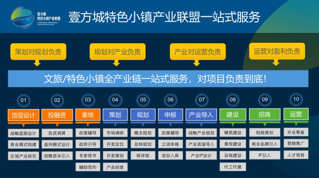 壹方城 是中国文旅康养、特色小镇产业生态圈服务的领跑者,是创新企业家学习平台、文旅康养、特色小镇产业创新方案集成者、创新项目IP孵化的实践者。公司致力于推动文旅康养、特色小镇行业的从开发到运营、从空间到内容的转型。依托强大的线上线下运营能力,致力于完善相关 产业链周边生态,成为最大的文旅康养、特色小镇产业综合服务平台
