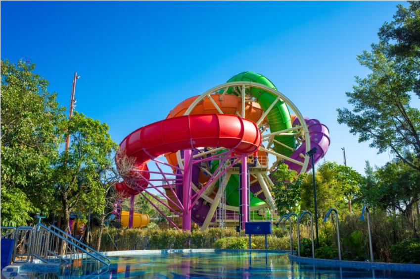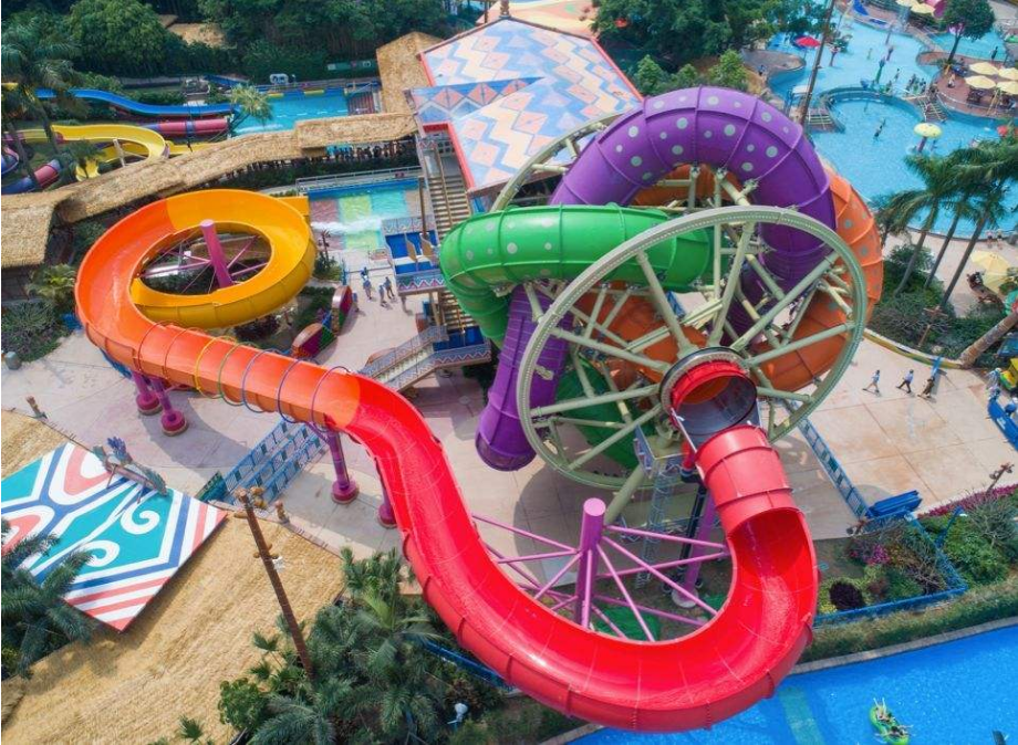 广州长隆水上乐园位于广州长隆旅游度假区,总占地面积30多万平方米,多年被IAAPA评为“全球必去水上乐园”,连续蝉联“全球入园人数最多水上乐园”。广州长隆摩天旋转滑道高24米,滑梯管长140米,直径2.7米。摩天旋转滑道水系统主要分为两部分,第一部分是功能性动力供水系统,在游客滑行的过程中源源不断提供润滑水,保护游客的安全;第二部分是跌落池的循环水系统,游客以较快的速度完成滑行体验后落入该池中。联盛公司在循环水系统和动力水系统方面均采用了目前较先进的水工艺设计,旋转滑道主轴带动滑道旋转两圈,游客在滑道里进行快速前进、左右摆动、急速倒退等多种滑行体验,摩天旋转滑道将过山车、U型滑板、甚至冲浪的体验结合在一起,全面挑战玩家们的感官极限。