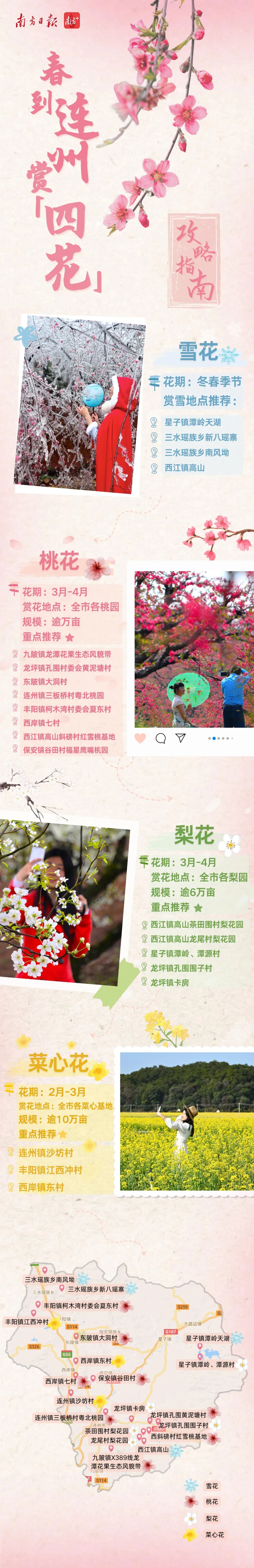 连州是中国生态旅游大市、中国最美休闲度假旅游城市、广东省旅游强市,素有“小广州”之称,已成粤北旅游标志城市。当前,连州数万亩桃园漫山红遍,十万亩菜心花海惆然怒放,梨花又将迎春盛开,掀起游客到连州赏花的热潮。