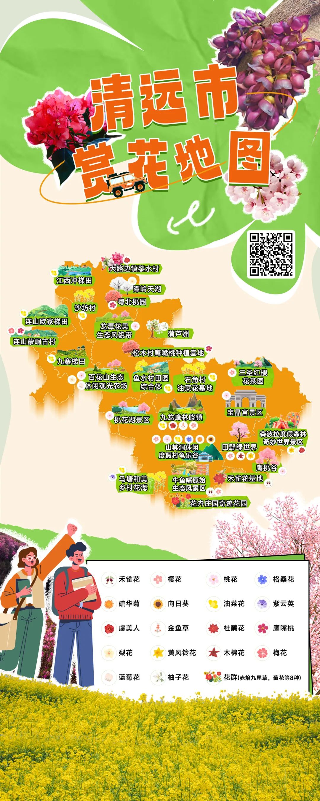 以花为媒,串联美食、民俗文化等旅游业态。当天,《清远市赏花电子地图》正式上线发布,推介了分布在清远全市8个县(市、区),共26个具有代表性的赏花地信息,为游客提供详实、贴心的一站式服务。