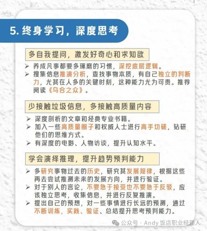 高手做事,做七分,留三分余地,说话也是一样。一方面,不会长话连篇,让对话者无法消化,这也是对人的尊重,留出让人思考的空间。另一方面,不会把话说满,世事无绝对,所有的事都是发展变化的,留三分余地更是认真负责的做法。说话先走心,然后要走脑子,最后才是表达出来,有了良好心态,下一步需要锻炼优秀的思维。