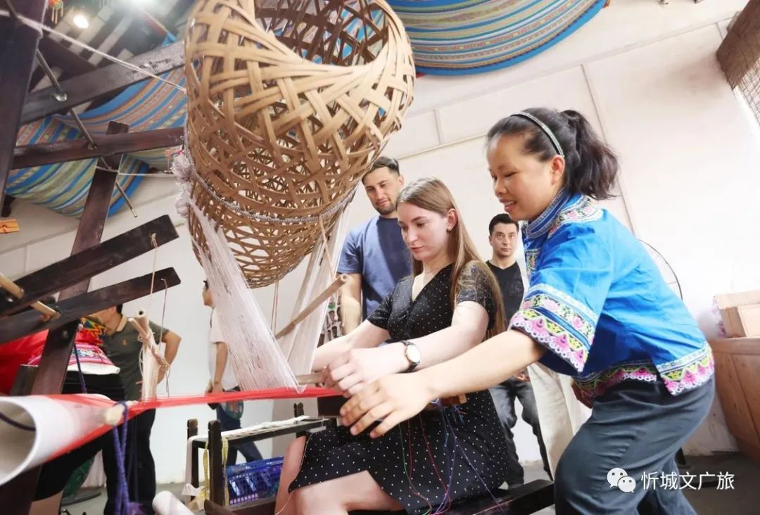 外国游客正在体验壮锦纺织技艺
