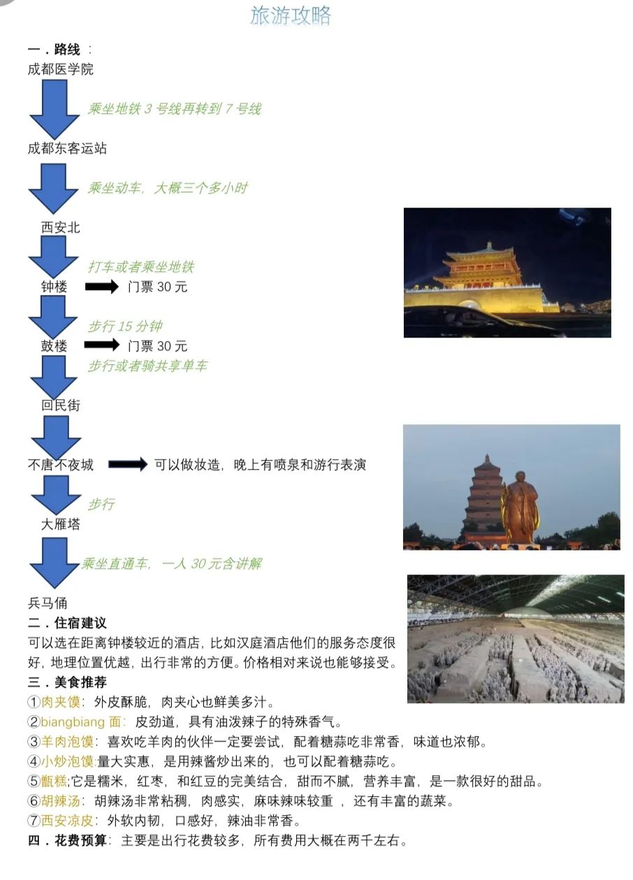 寒假尾奏的消散,伴随着学子们的游山玩水而归,忙忙碌碌的学习生活即将开始,各位学子定有许多未去而挂念的地方,内心还有所惋惜。为展现同学们的旅游兴趣之地,对心目中城市的向往,成医学子们可以通过笔触来描绘旅游规划,整合信息,提高选择能力,为学习之余的时间锦上添花。为提高成医学子对名胜古迹的了解,拓宽成医学子的眼界,并展现成医学子丰富的行动力,成都医学院青年志愿者协会临床分会与新媒体于2024年2月29日至3月03日共同举办了以"背上行囊,马上出发"为主题的周边旅游攻略分享活动。