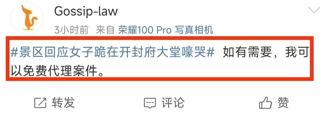 一位律师网友在看到此情景后,隔空喊话该女子:“如有需要,我可以免费代理案件。”