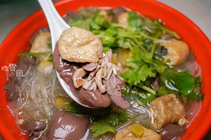 一碗纯正的鸭血粉丝汤,鸭血、鸭肠、鸭肝、豆腐果和粉丝是经典标配。