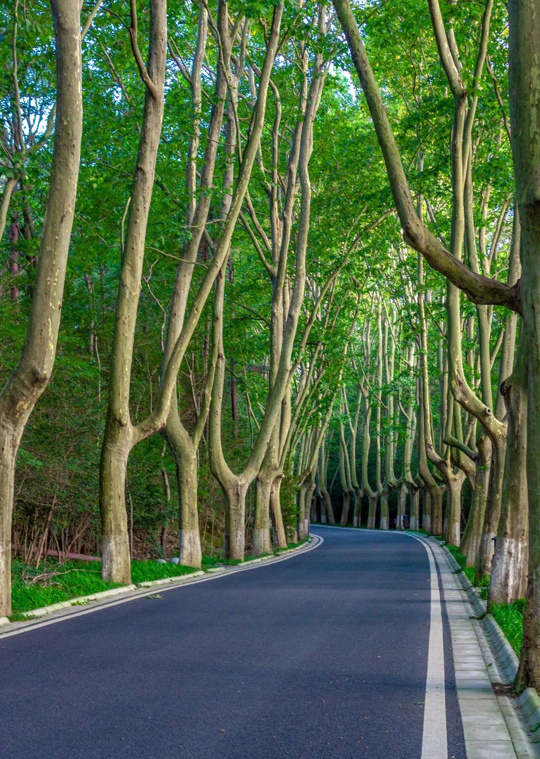 夏季的梧桐满是青葱,绿色长廊的气氛瞬间拉满,山路两侧的遮天梧桐像夏日的守护者夹道欢迎。