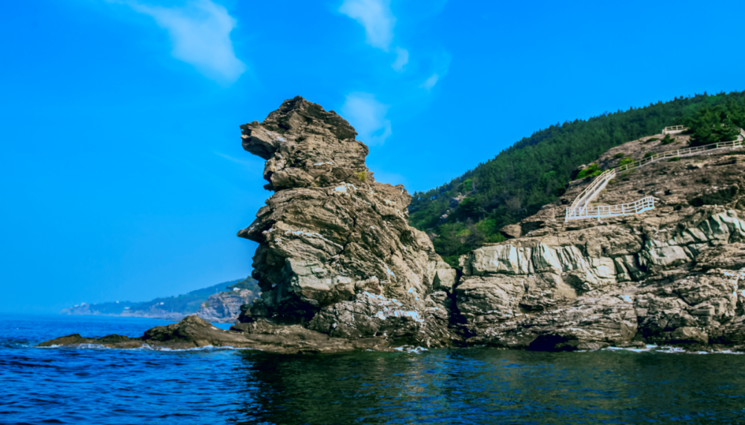 鹰嘴石坐落在獐子岛东南部的悬崖峭壁上,它是獐子岛最具代表性的礁石。它头朝南,尾朝北,昂首的巨石神似雄鹰,人们管它叫鹰嘴石。