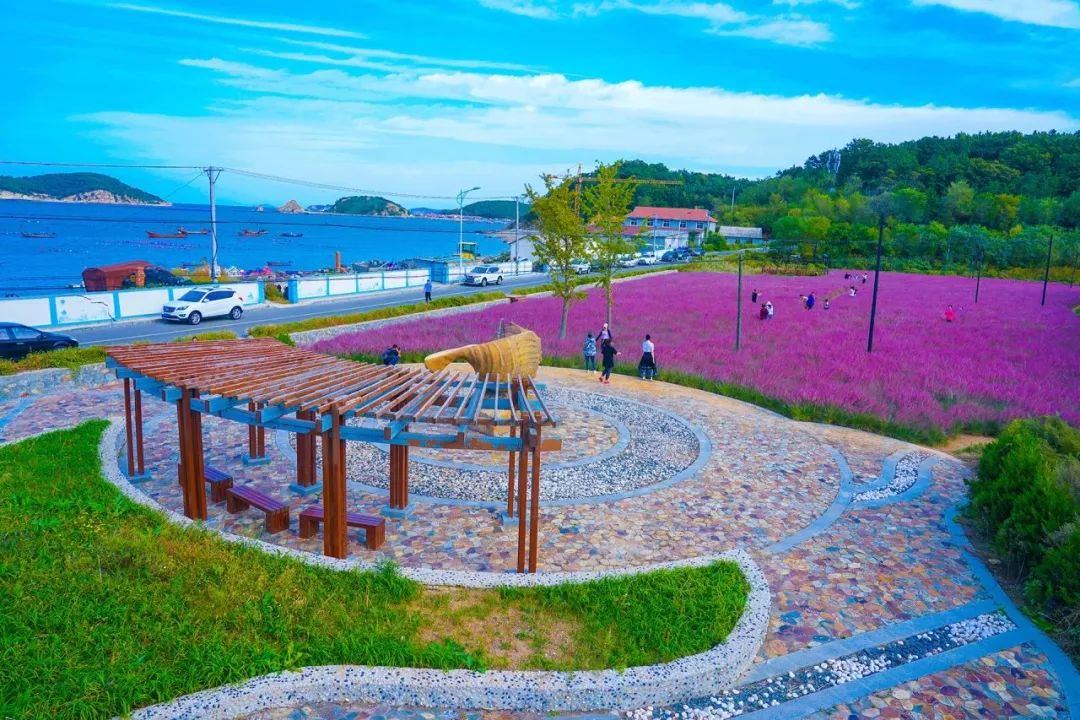 圆梦缘花园位于大长山岛镇城岭村老网场,大片粉黛乱子草盛放,小小的花穗像发丝一般呈现出粉色云雾,远看如霞如锦绵延如浪。