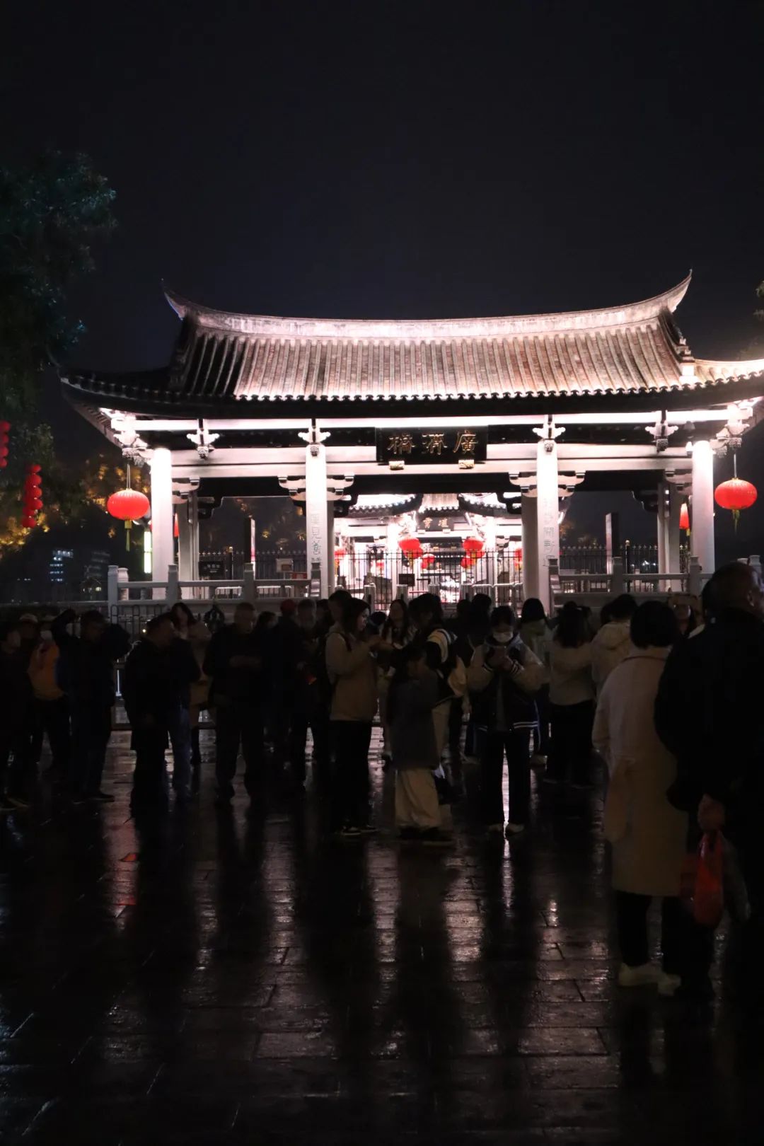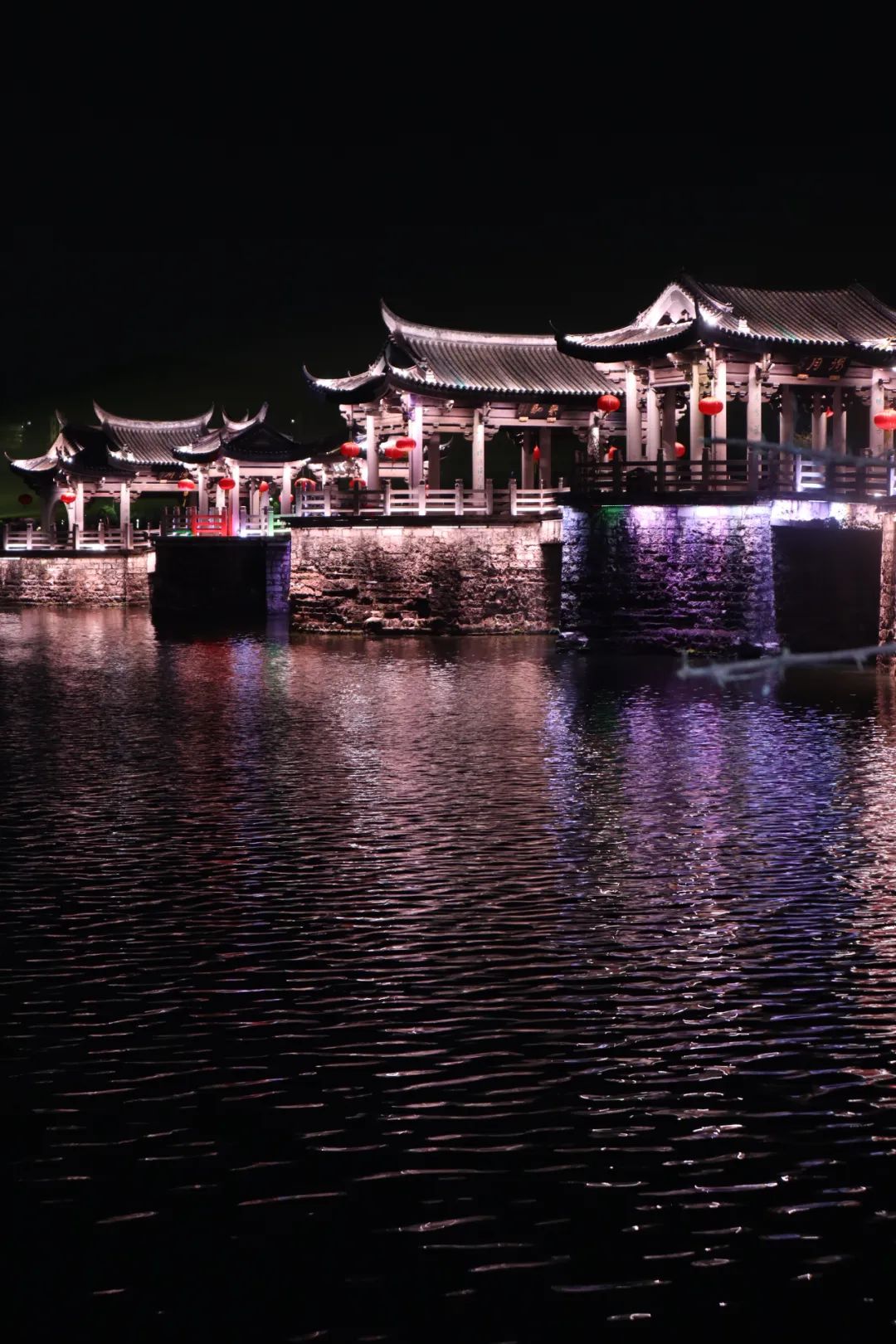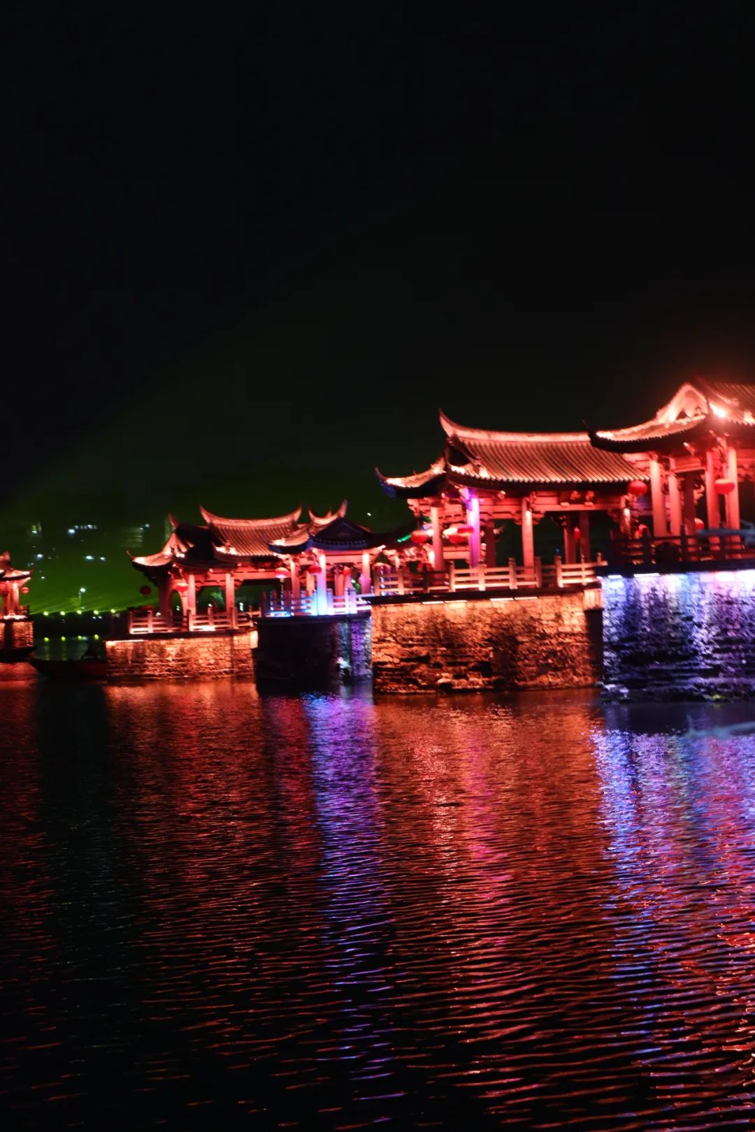 还好没有下雨,也不是很冷,靠在岸边等待了一个多小时,终于看到了所谓的「广济桥灯光秀」,15分钟的灯光变换,怎么说呢,个人觉得真的挺一般的~